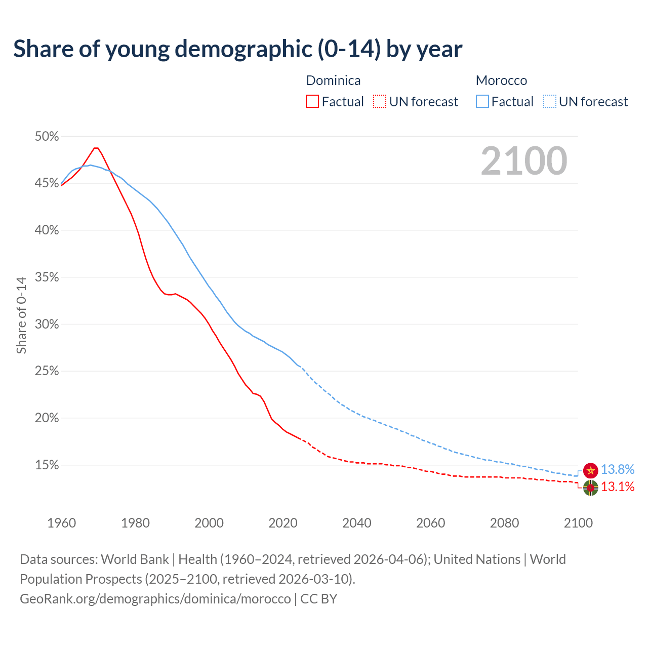 - The share of young demographic (0-15 years old) in Dominica is 17.9% vs 25.6% in Morocco.