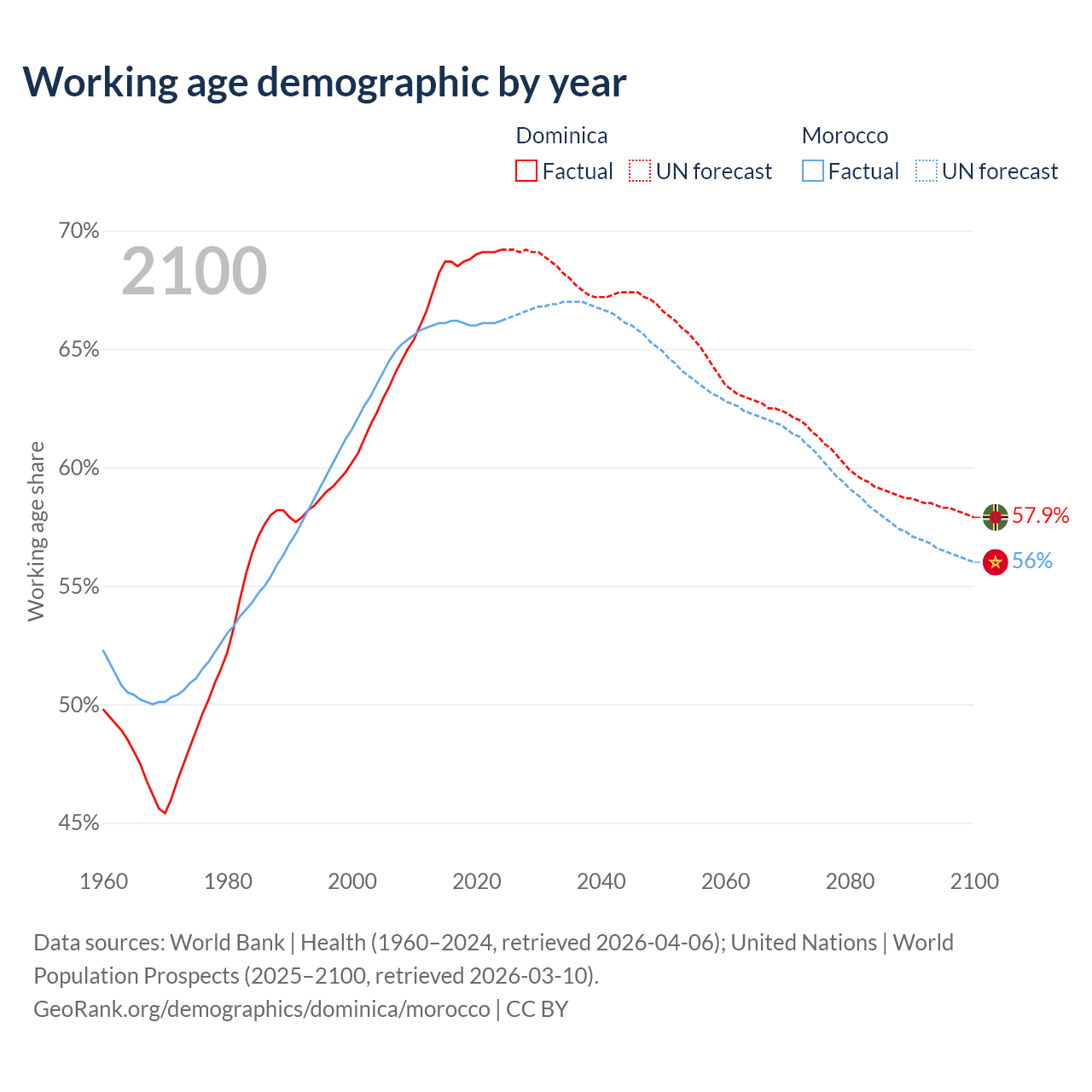 - Dominica has 45.3K working age adults (aged 15-64) vs 25.7M in Morocco.