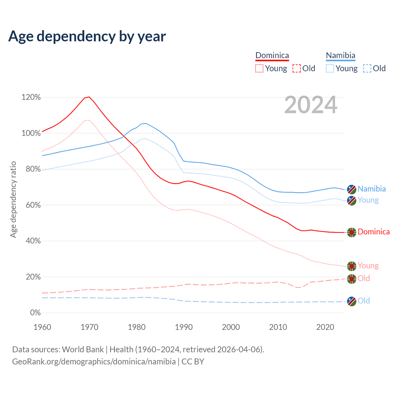 - Dominica is ranked 66/196 by median age (oldest to youngest) vs 147/196 for Namibia.