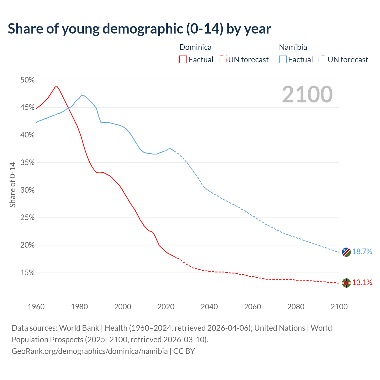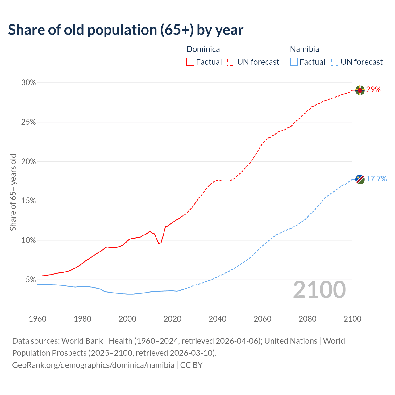 Median age Dominica vs Namibia, 1960-2100