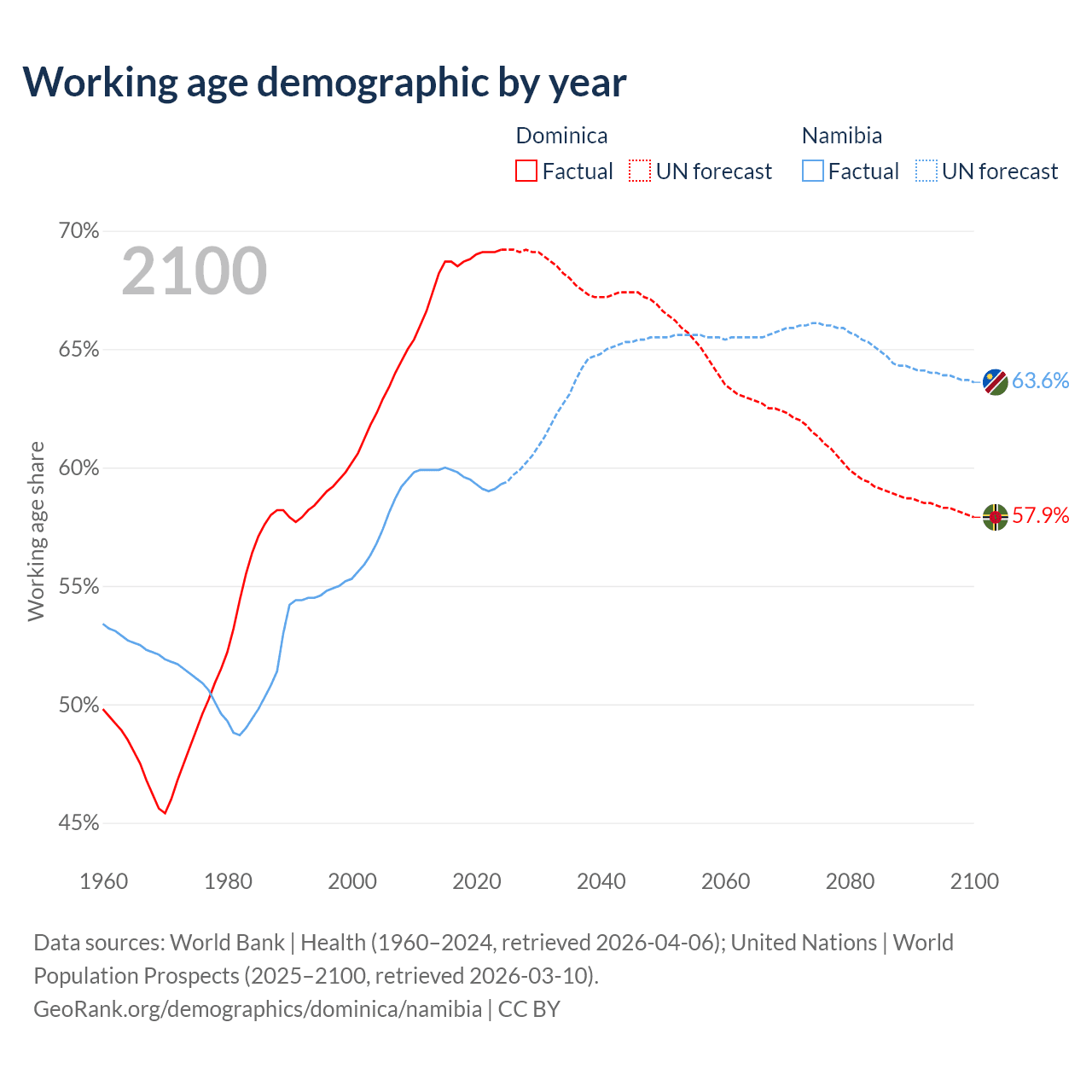 - Dominica has 45.3K working age adults (aged 15-64) vs 1.88M in Namibia.