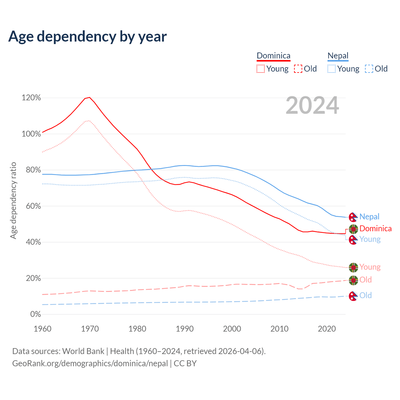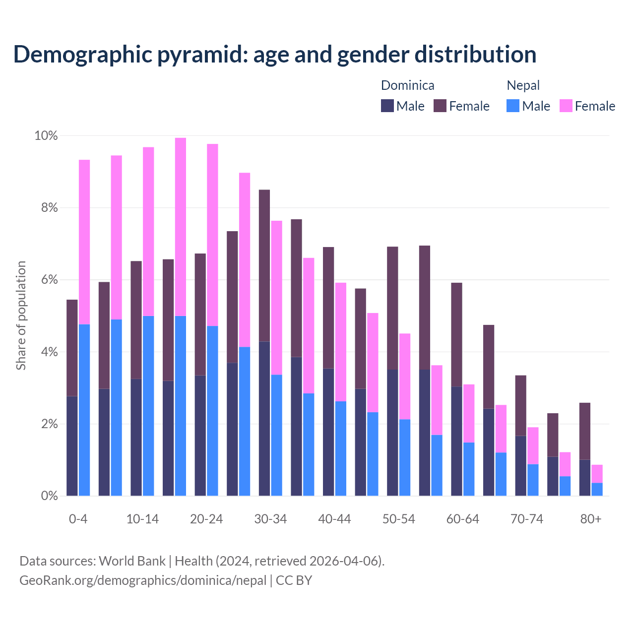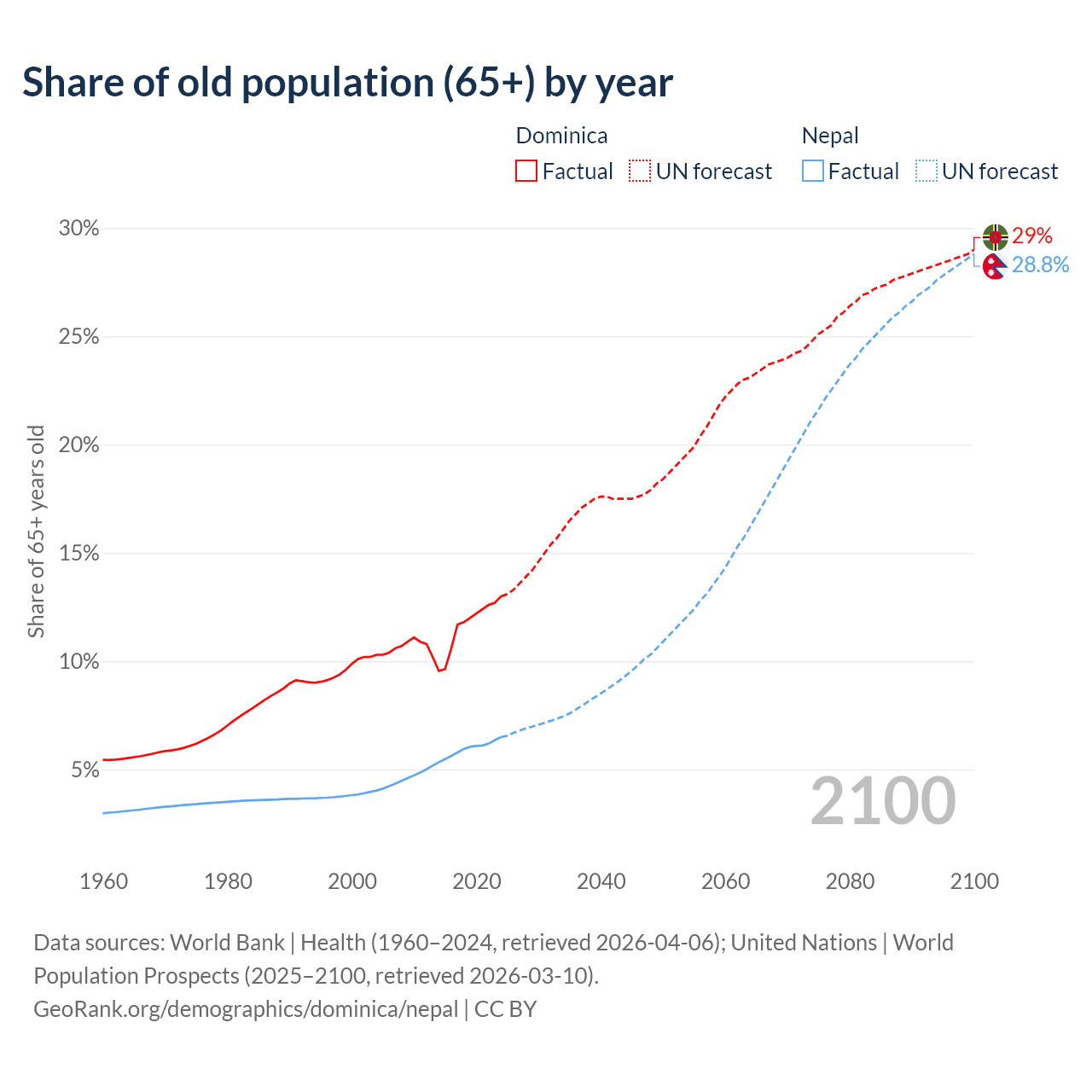 - The share of old-age demographic (65+) in Dominica is 13% vs 6.5% in Nepal.