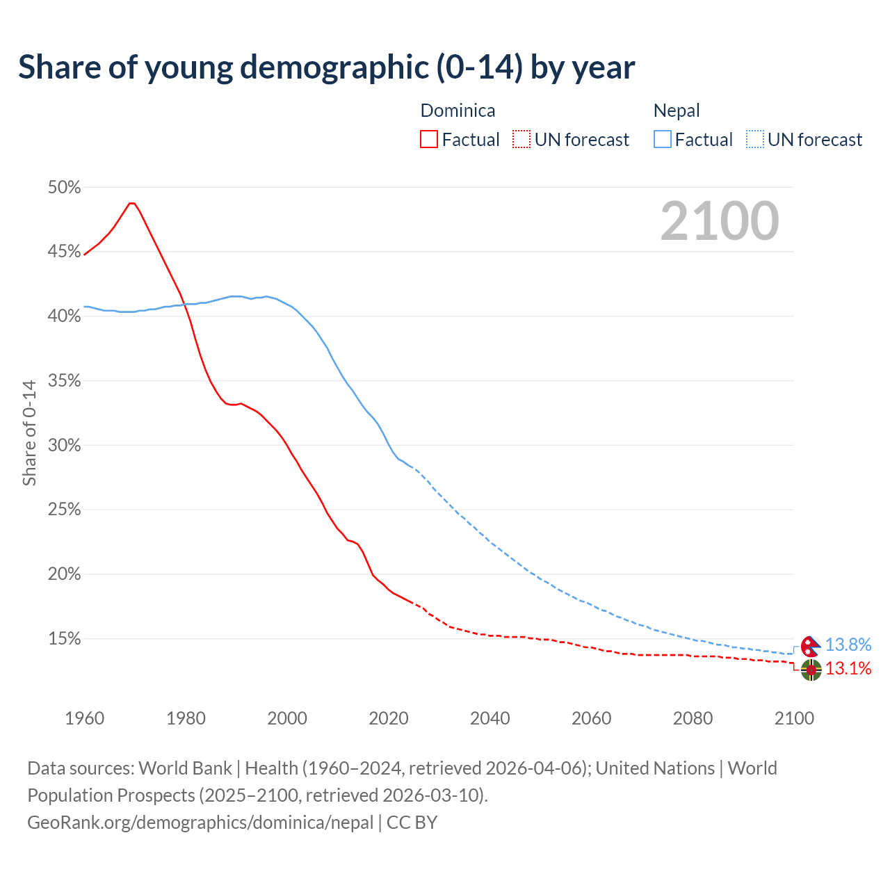 - The share of young demographic (0-15 years old) in Dominica is 17.9% vs 28.4% in Nepal.