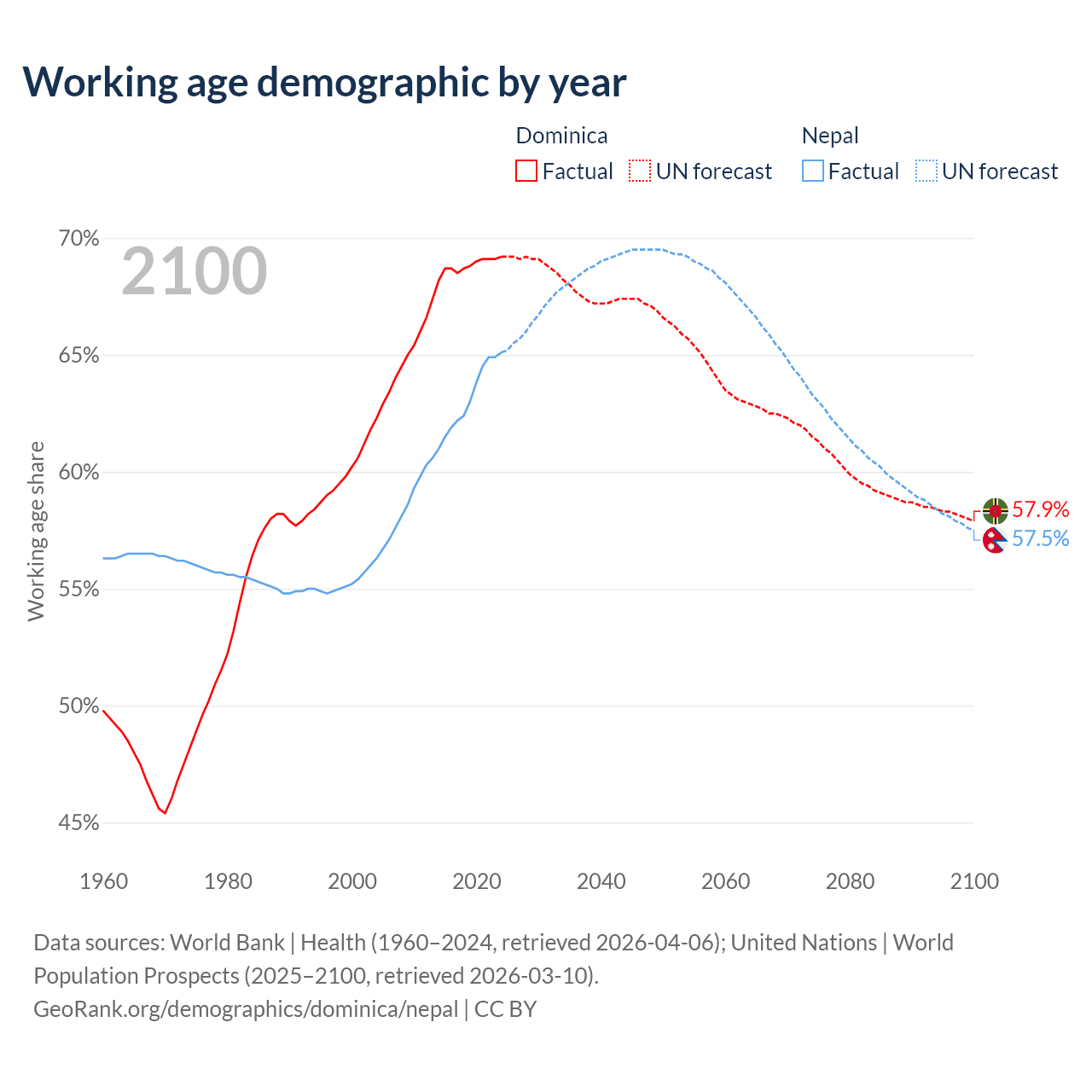 - Dominica has 45.3K working age adults (aged 15-64) vs 19.3M in Nepal.