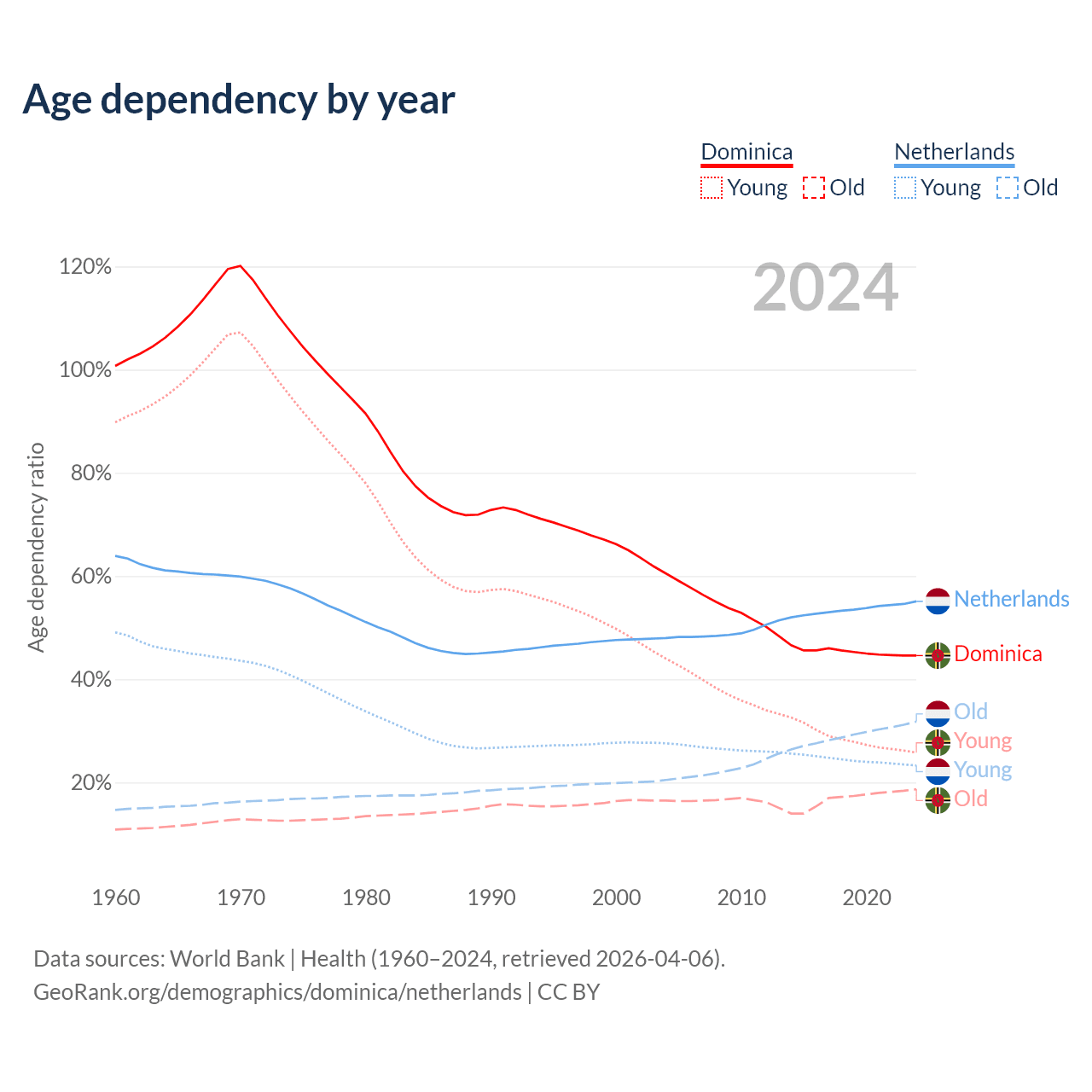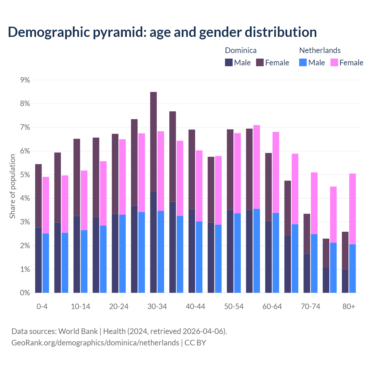 - Dominica is ranked 66/196 by median age (oldest to youngest) vs 33/196 for the Netherlands.