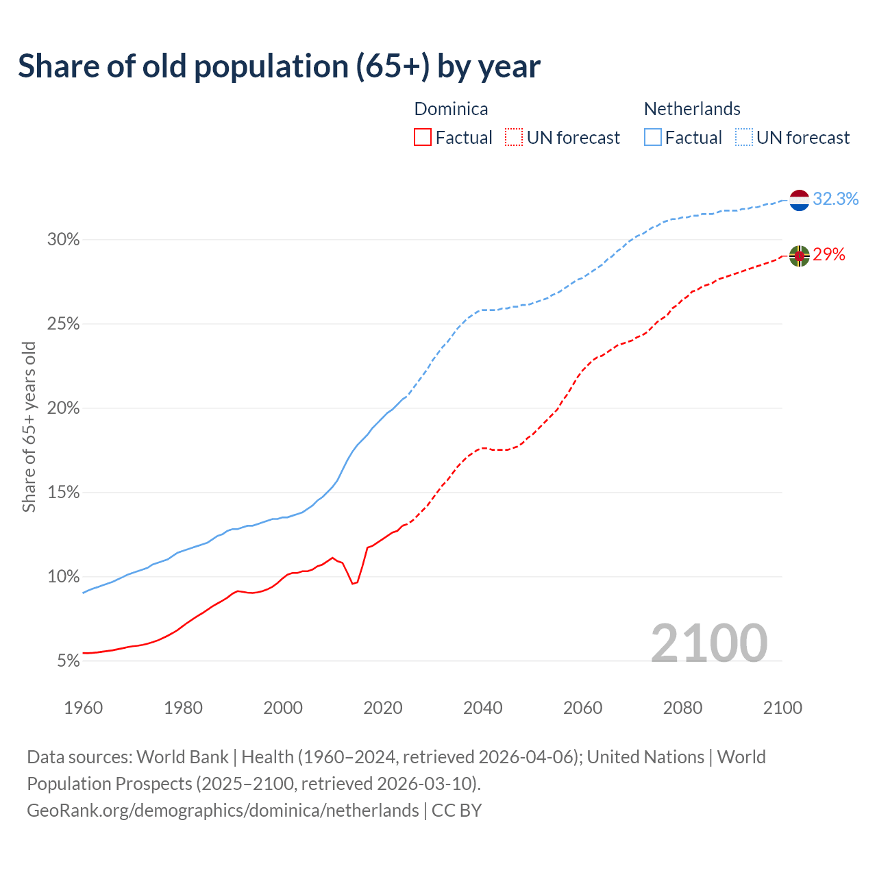 - The share of old-age demographic (65+) in Dominica is 13% vs 20.5% in the Netherlands.
