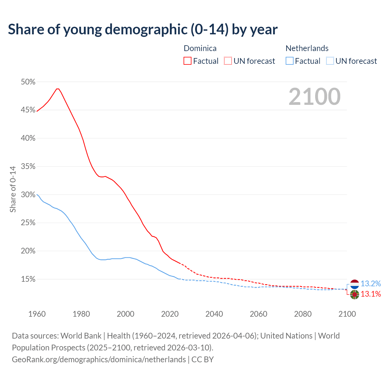- The share of young demographic (0-15 years old) in Dominica is 17.9% vs 15% in the Netherlands.