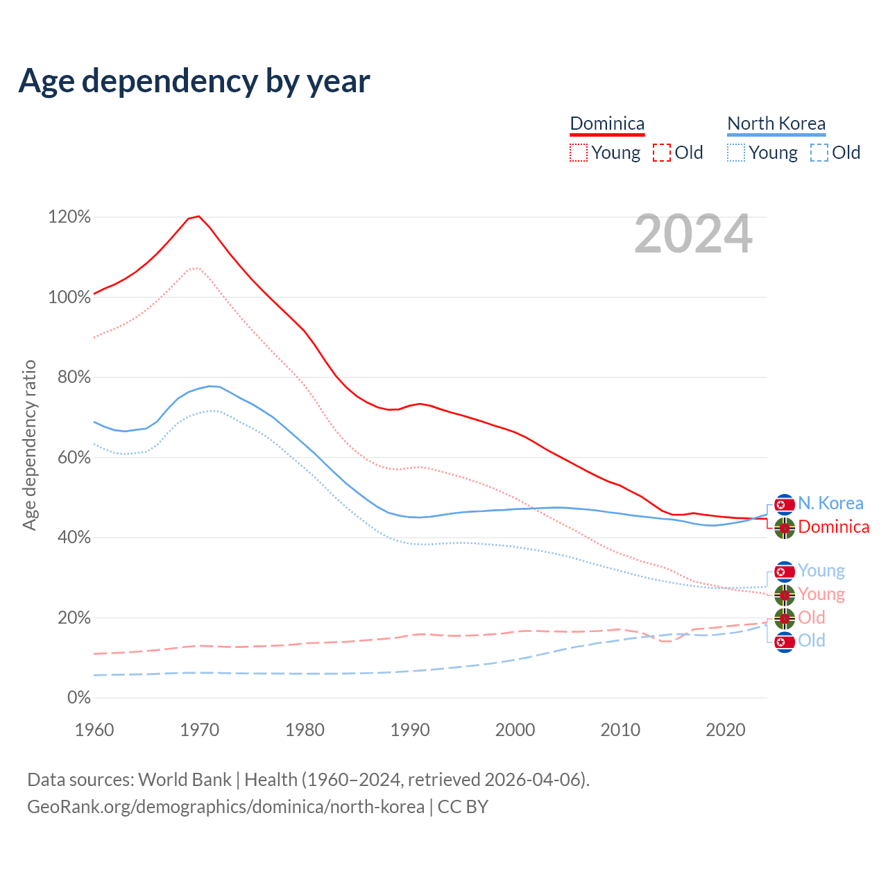- The share of old-age demographic (65+) in Dominica is 13% vs 12.4% in North Korea.