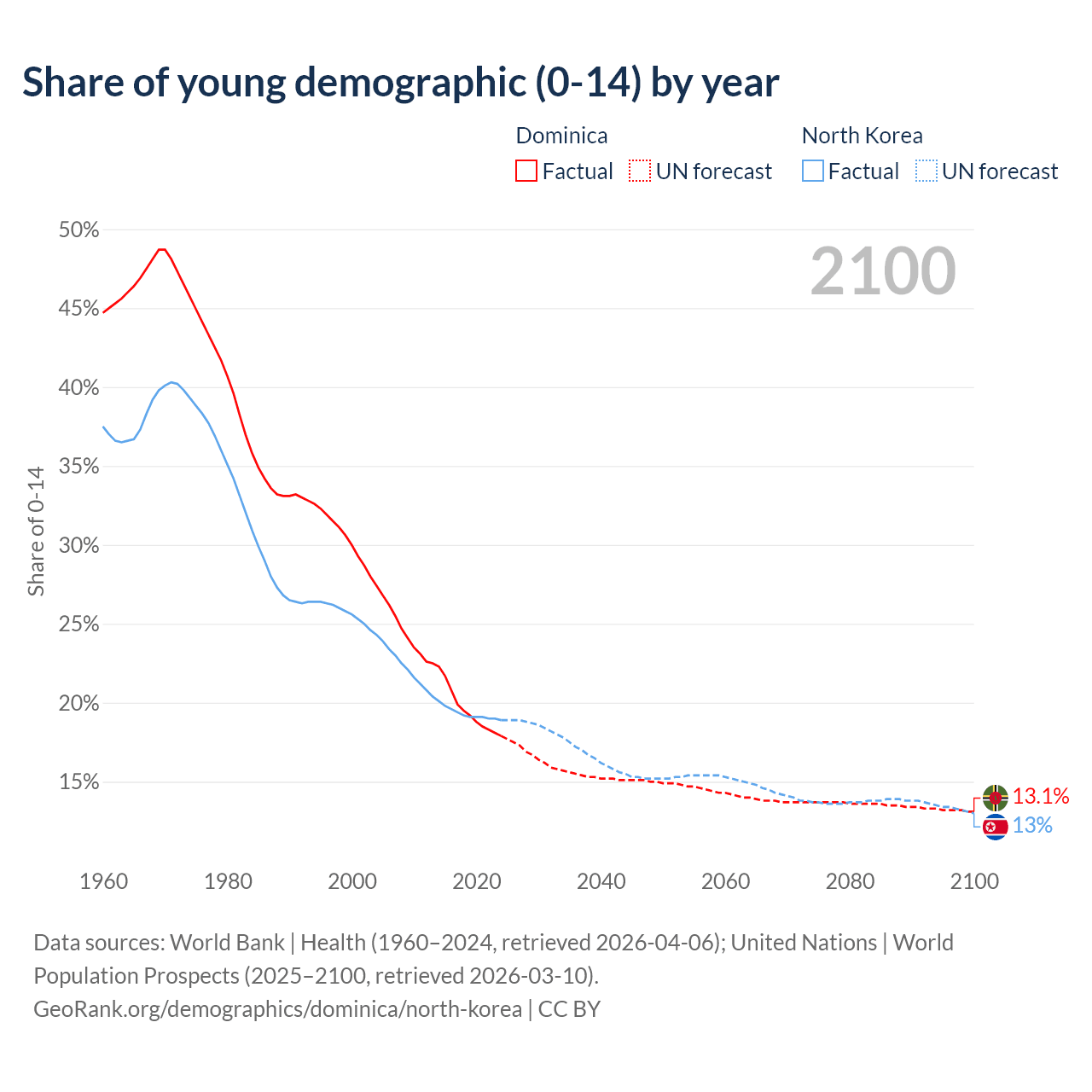 - The share of young demographic (0-15 years old) in Dominica is 17.9% vs 18.9% in North Korea.