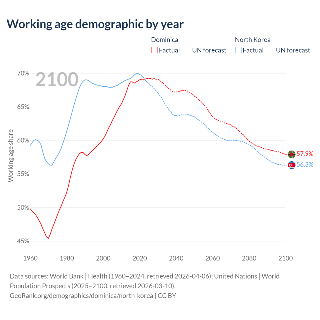 - Dominica has 45.3K working age adults (aged 15-64) vs 18.3M in North Korea.