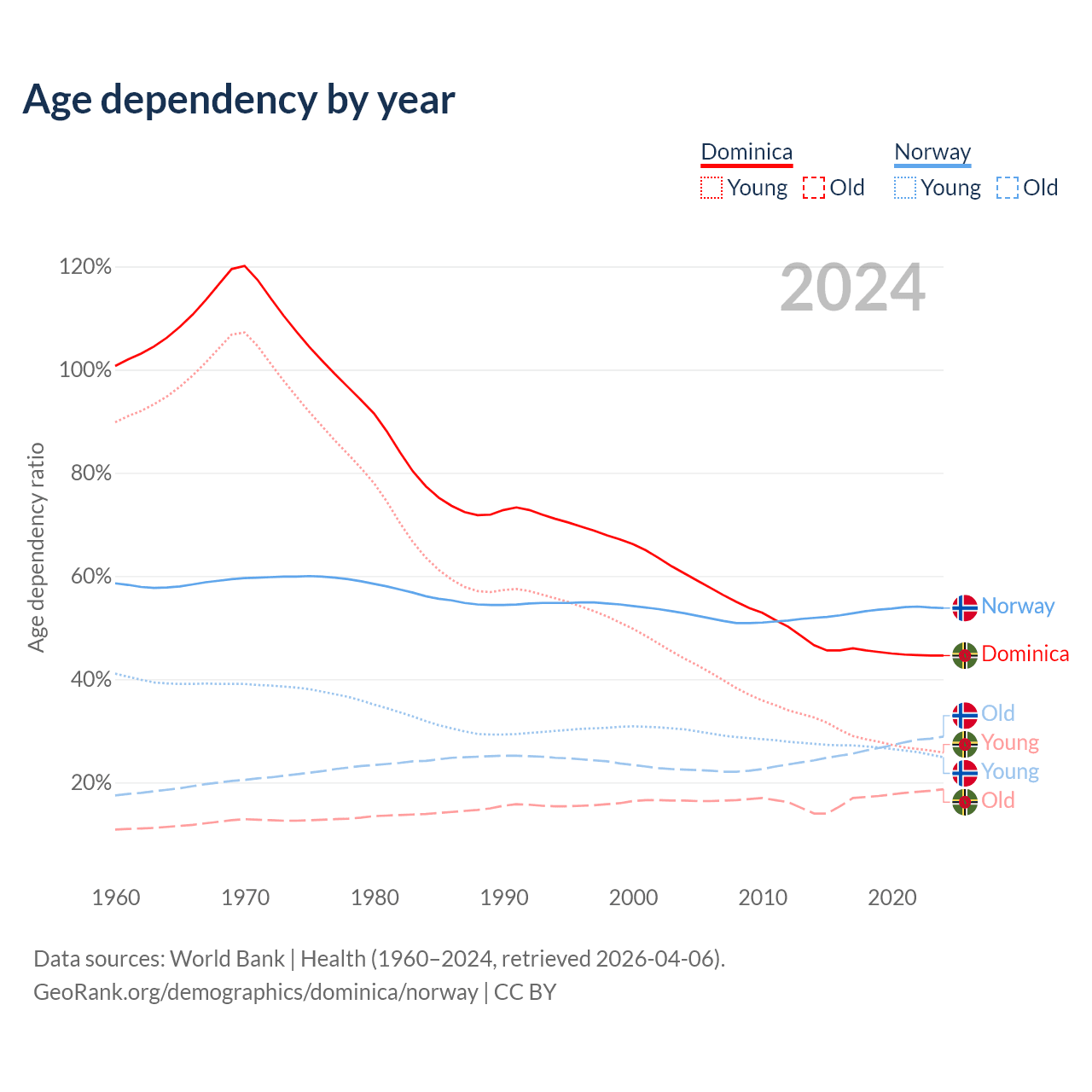 - Dominica is ranked 66/196 by median age (oldest to youngest) vs 43/196 for Norway.