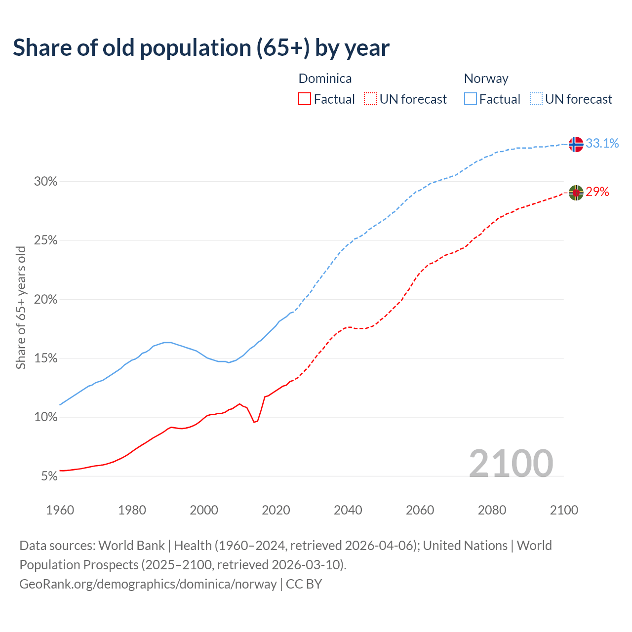 The share of older people aged 65 and over is 13% in Dominica and 18.8% in Norway. Life expectancy in Dominica compared to Norway .