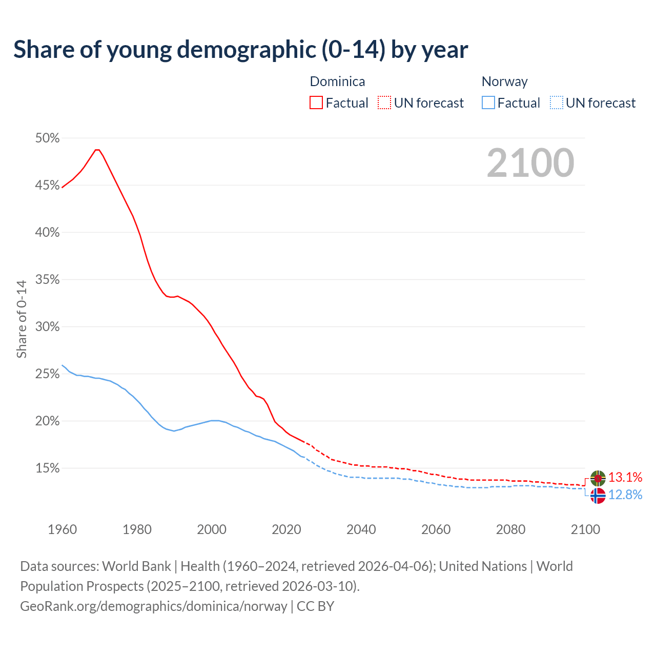 - The share of young demographic (0-15 years old) in Dominica is 17.9% vs 16.2% in Norway.