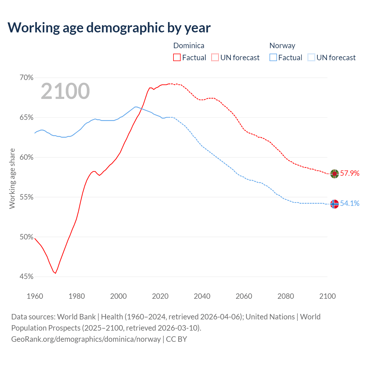 - Dominica has 45.3K working age adults (aged 15-64) vs 3.69M in Norway.