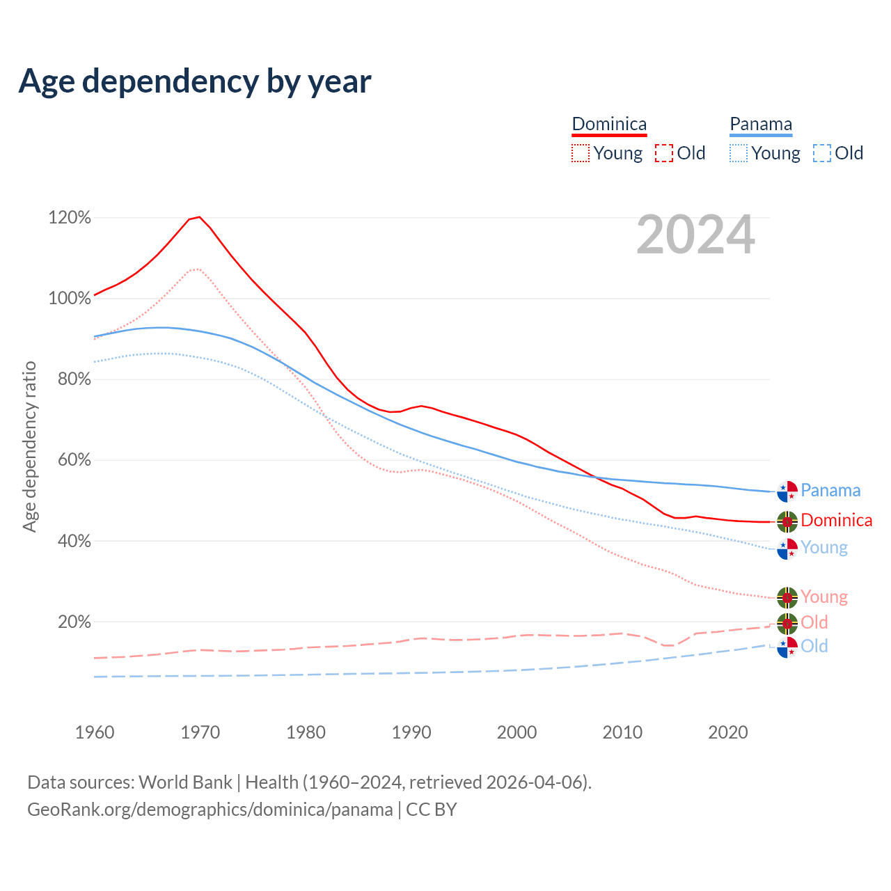- Dominica is ranked 66/196 by median age (oldest to youngest) vs 94/196 for Panama.