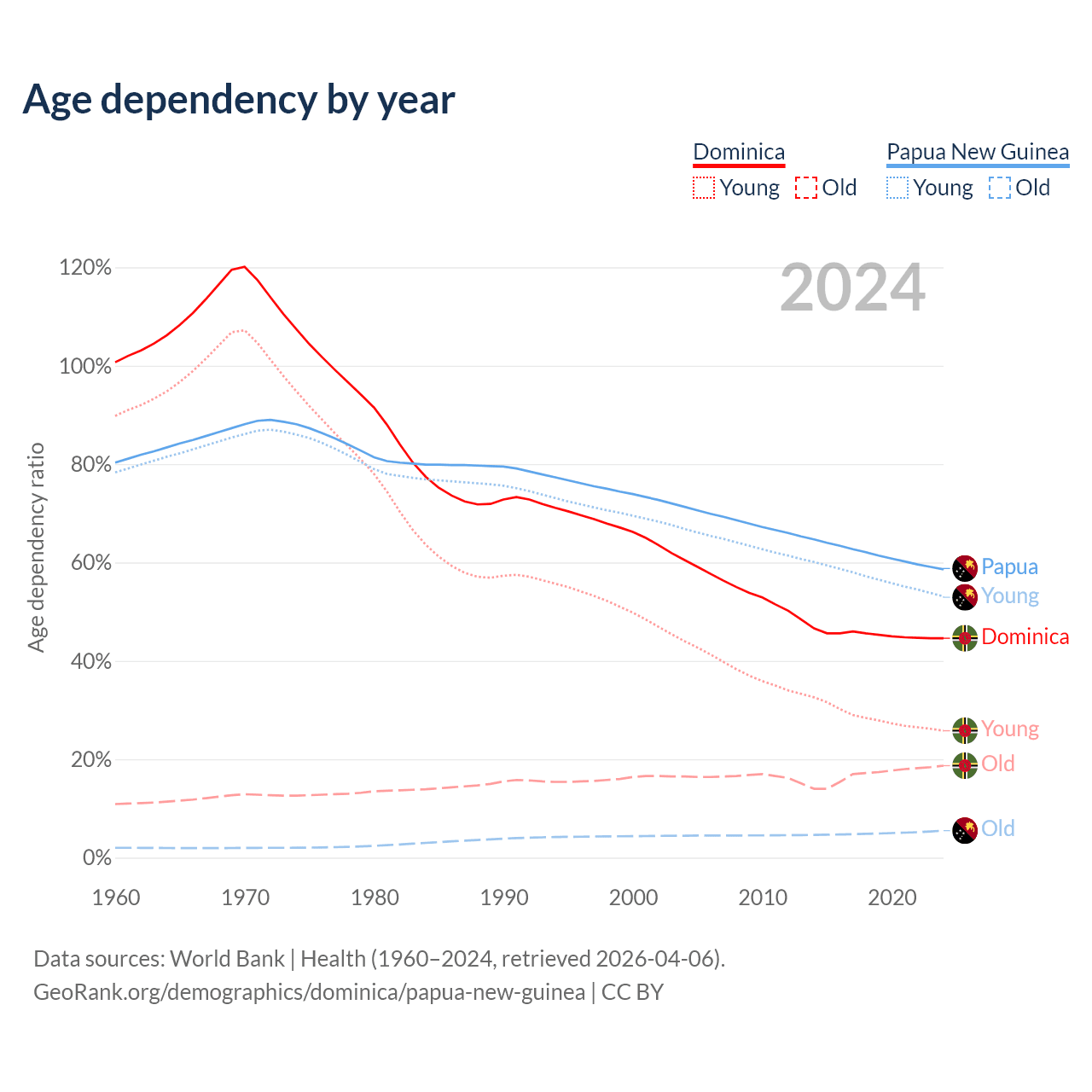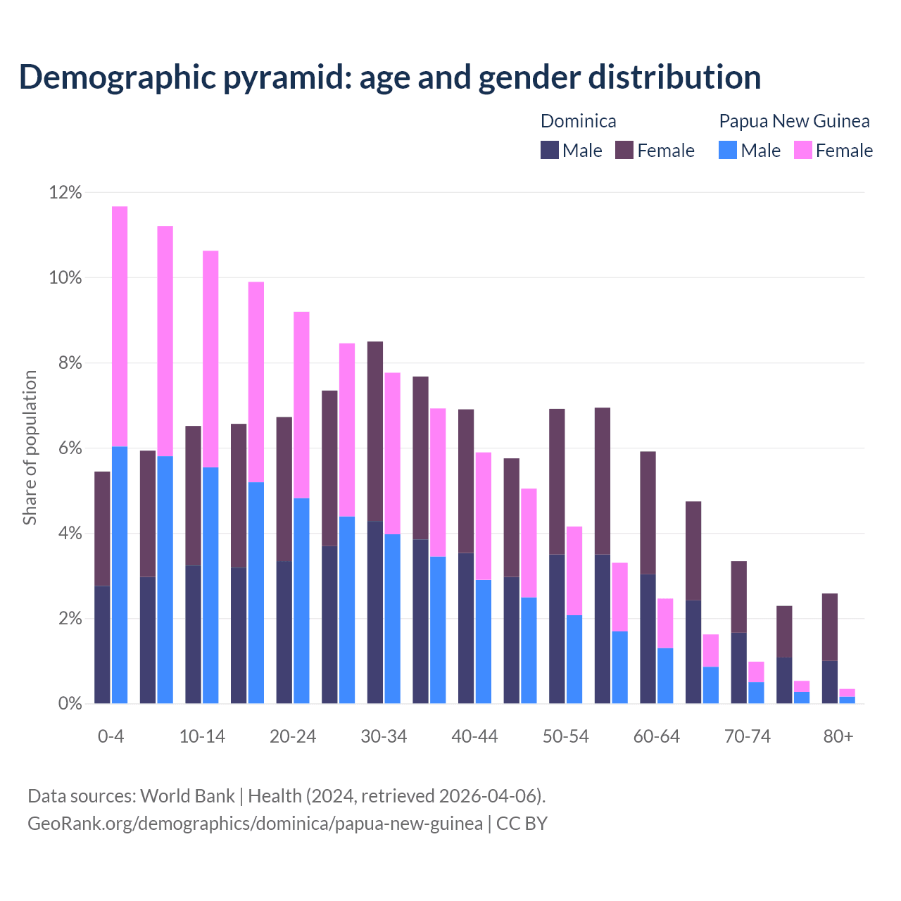 - Dominica is ranked 66/196 by median age (oldest to youngest) vs 140/196 for Papua New Guinea.
