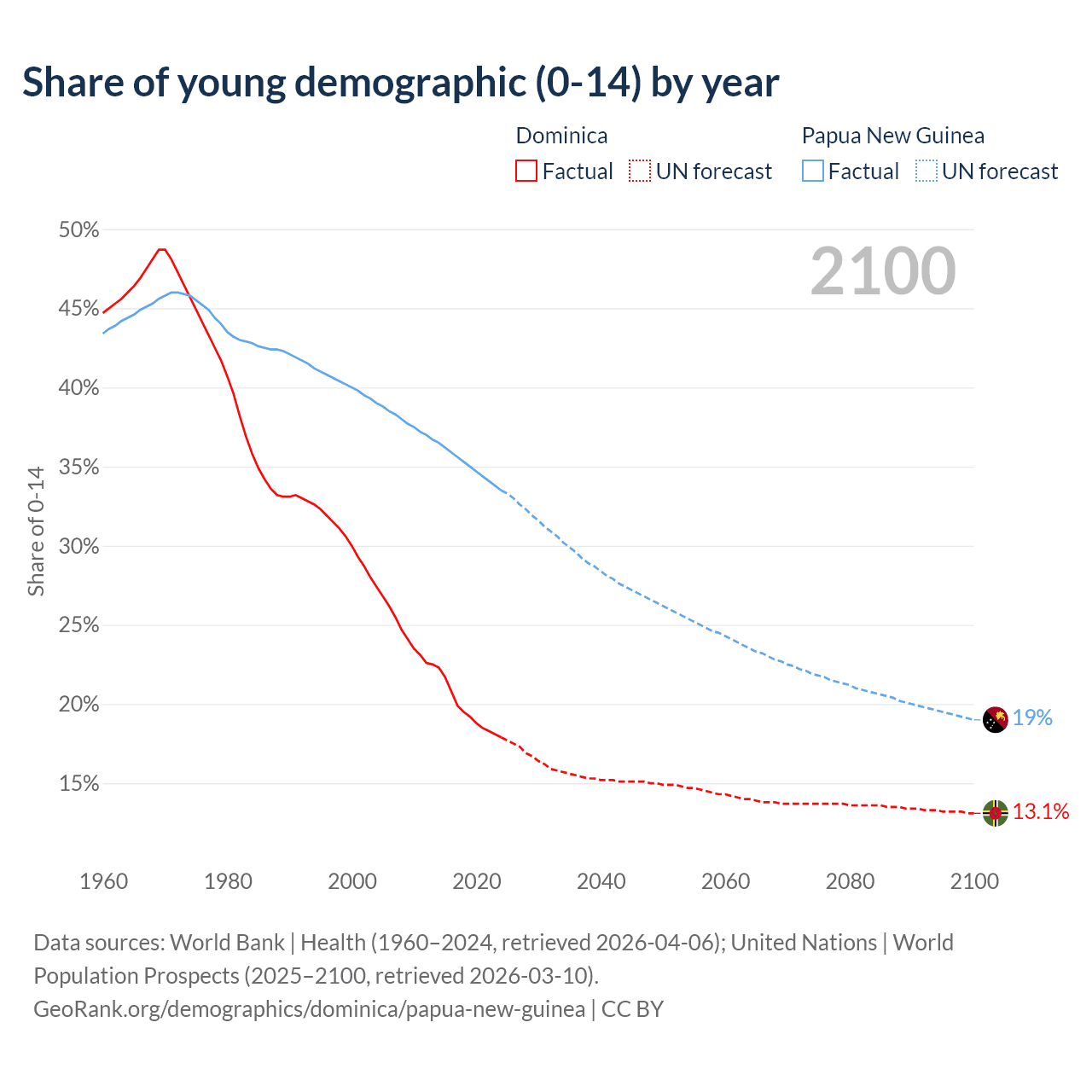 - The share of young demographic (0-15 years old) in Dominica is 17.9% vs 33.5% in Papua New Guinea.