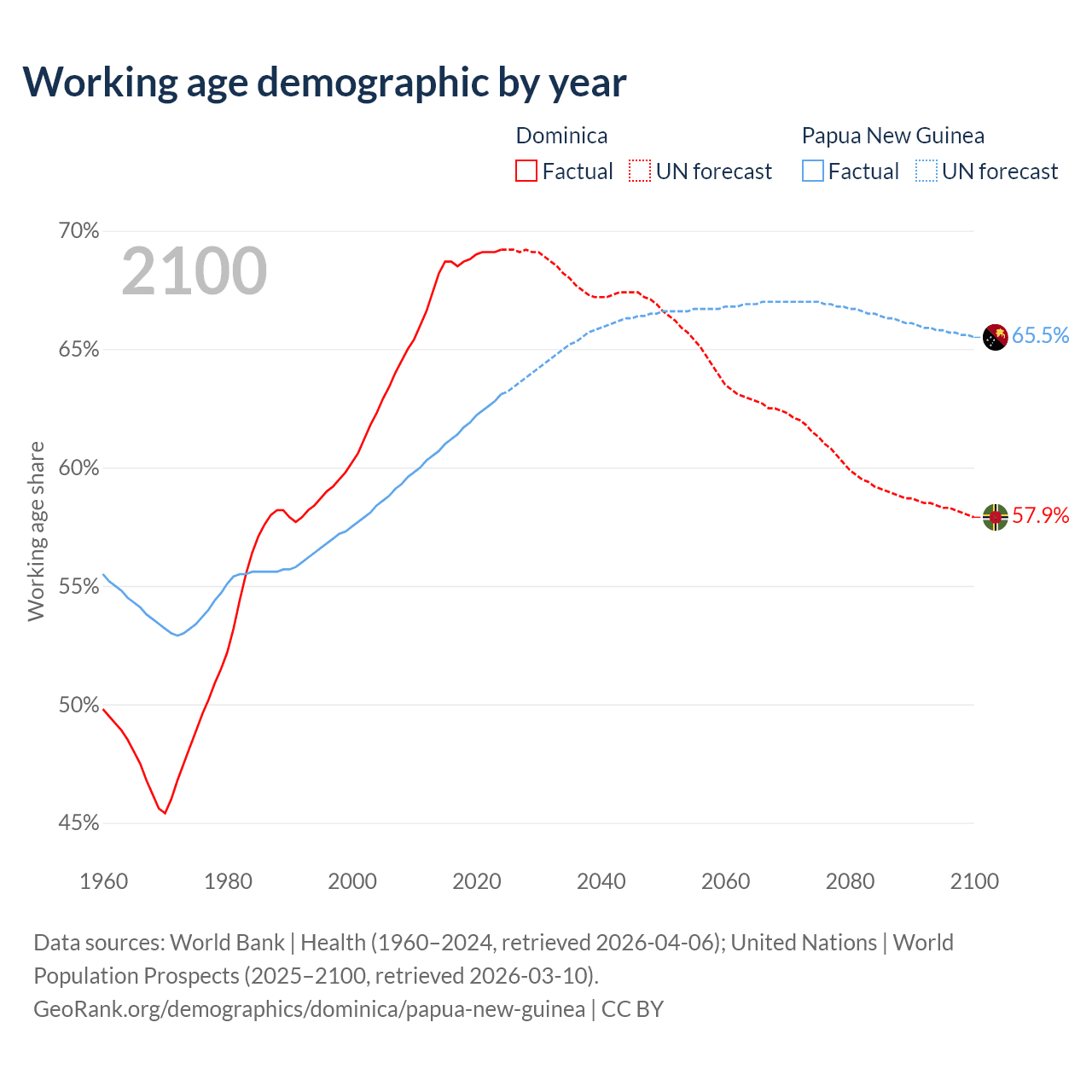 - Dominica has 45.3K working age adults (aged 15-64) vs 6.94M in Papua New Guinea.