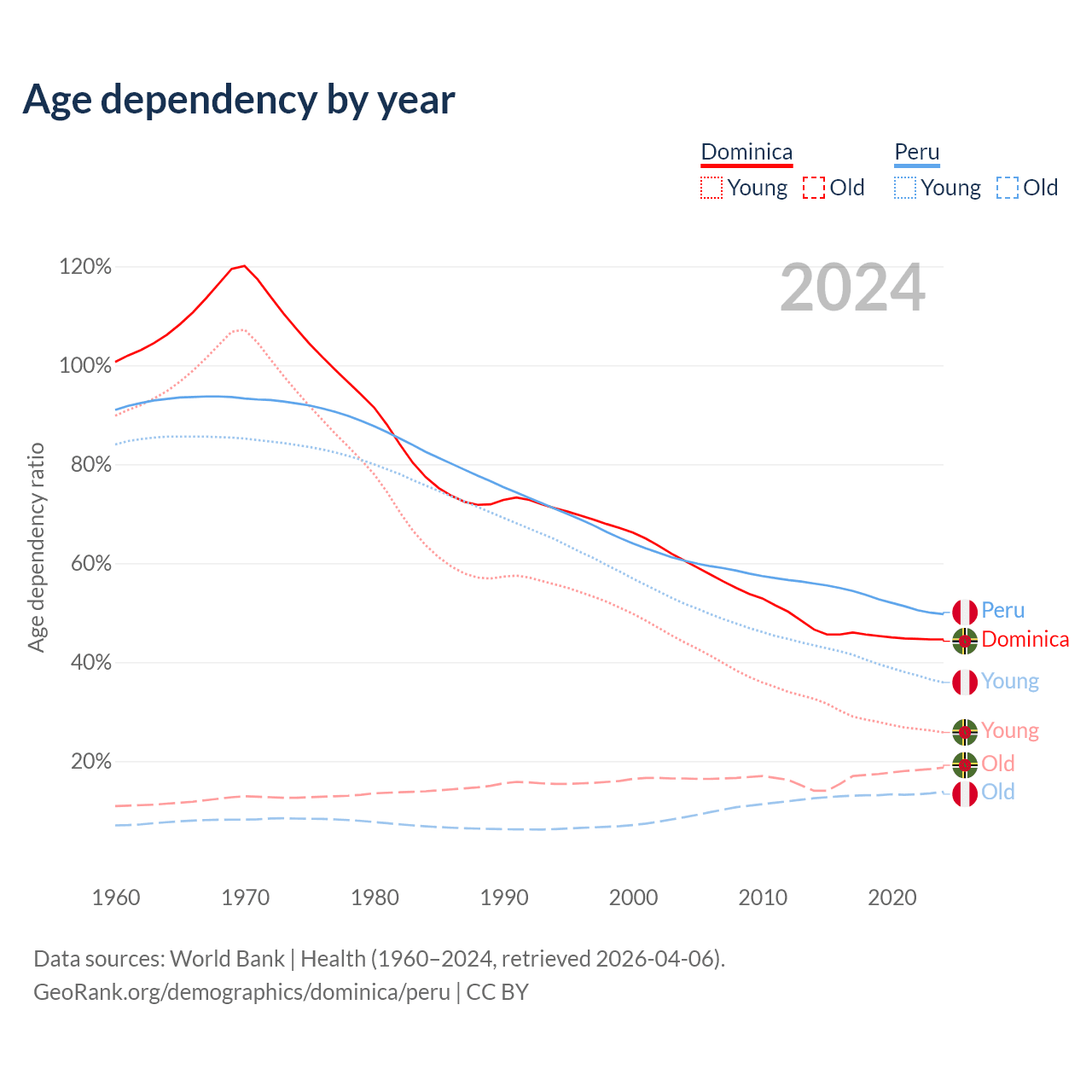 - Dominica is ranked 66/196 by median age (oldest to youngest) vs 97/196 for Peru.