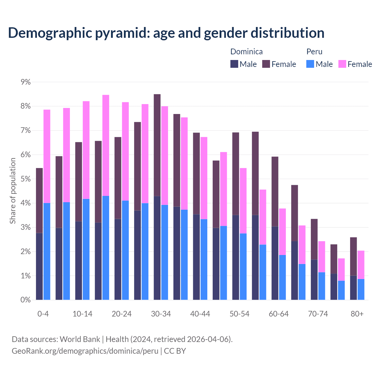 - As of 2026, the population of Dominica is 65.5K vs 35M in Peru - 535 times difference.