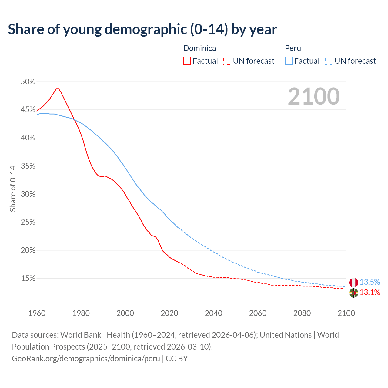 - The share of young demographic (0-15 years old) in Dominica is 17.9% vs 24% in Peru.