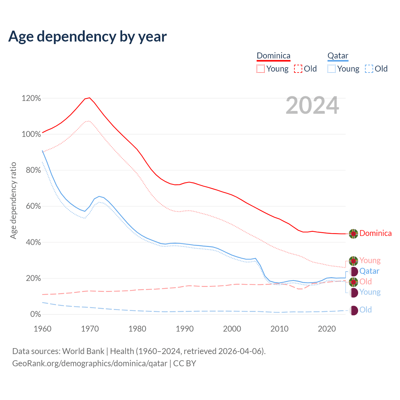 - Dominica is ranked 66/196 by median age (oldest to youngest) vs 78/196 for Qatar.