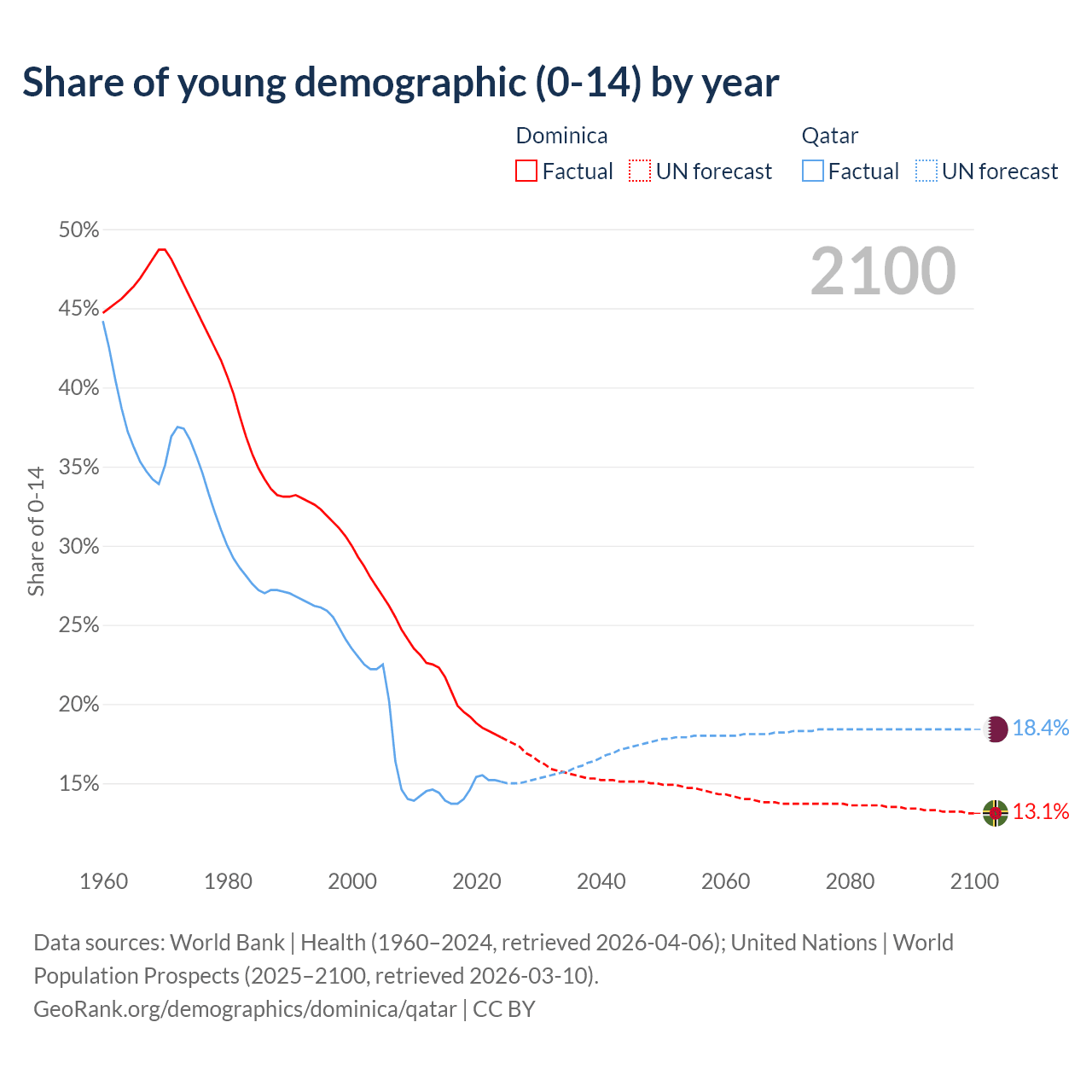 - The share of young demographic (0-15 years old) in Dominica is 17.9% vs 15.1% in Qatar.