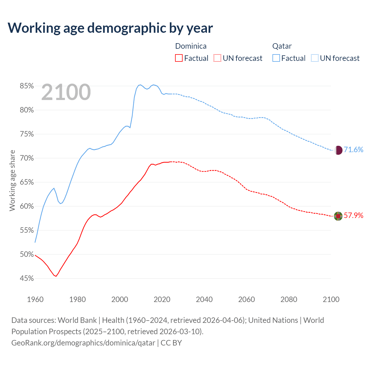 - Dominica has 45.3K working age adults (aged 15-64) vs 2.5M in Qatar.