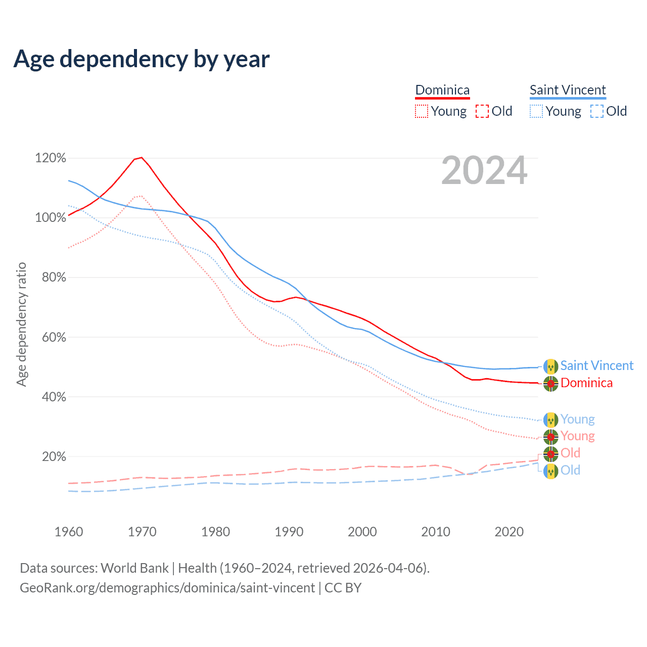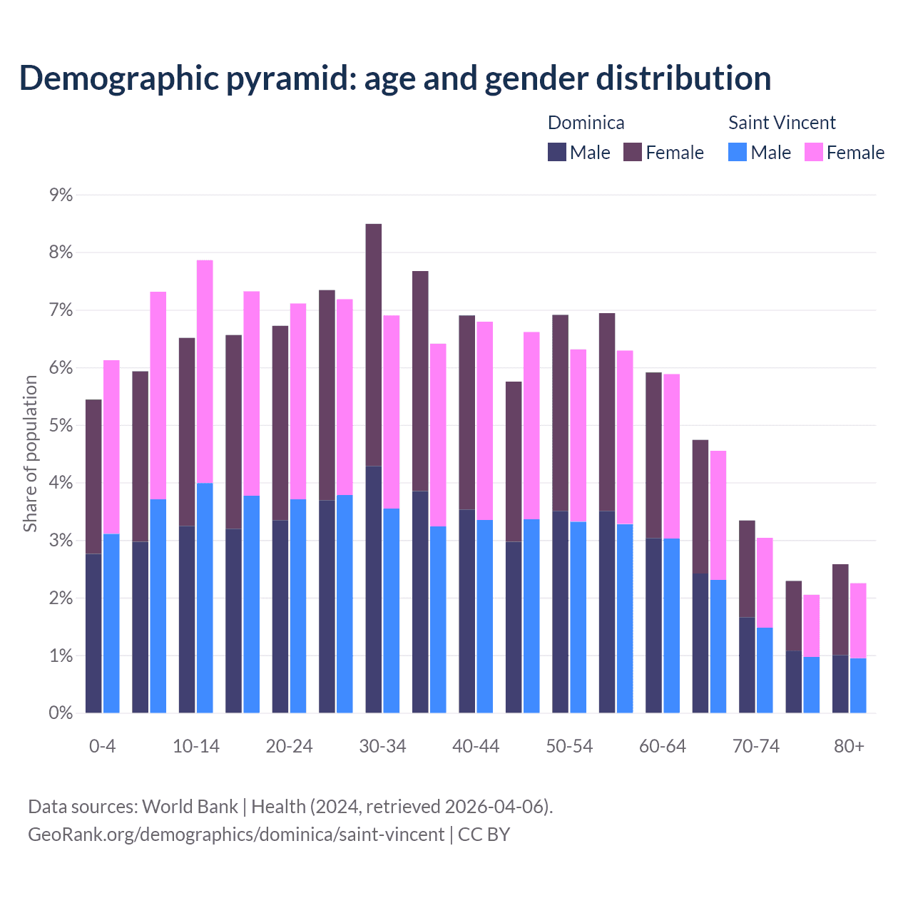 - Dominica is ranked 66/196 by median age (oldest to youngest) vs 75/196 for Saint Vincent.