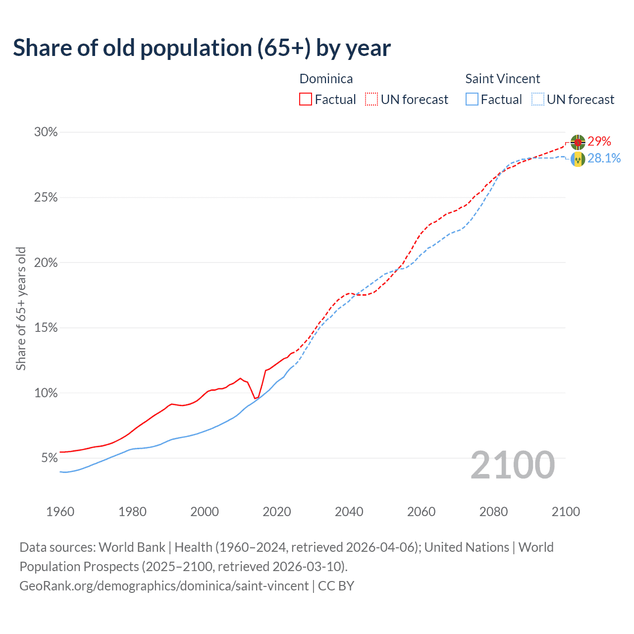 The share of older people aged 65 and over is 13% in Dominica and 11.9% in Saint Vincent. Life expectancy in Dominica compared to Saint Vincent .