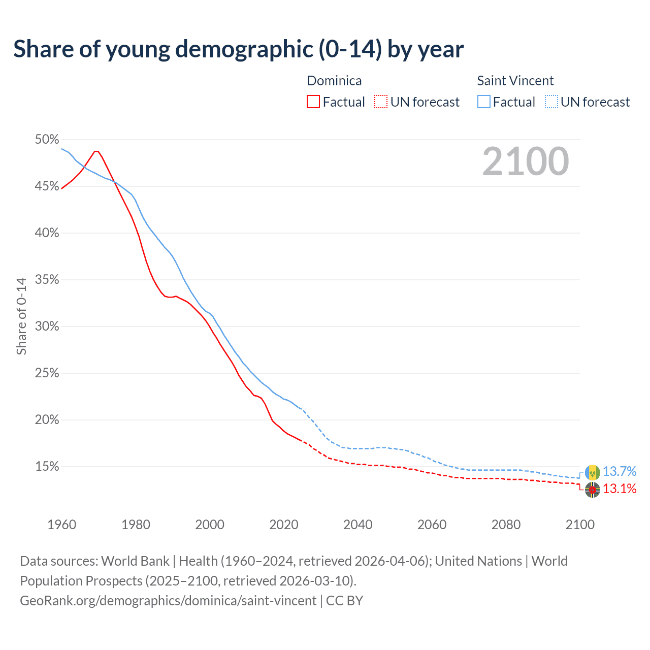 - The share of young demographic (0-15 years old) in Dominica is 17.9% vs 21.3% in Saint Vincent.
