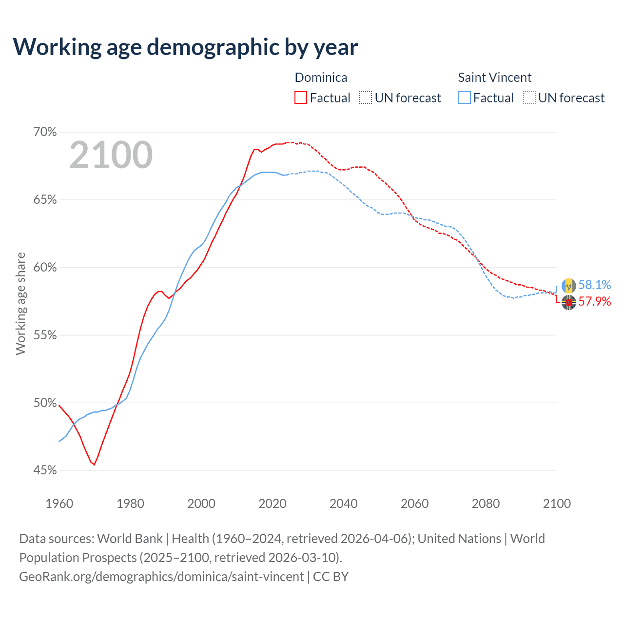 - Dominica has 45.3K working age adults (aged 15-64) vs 66.3K in Saint Vincent.