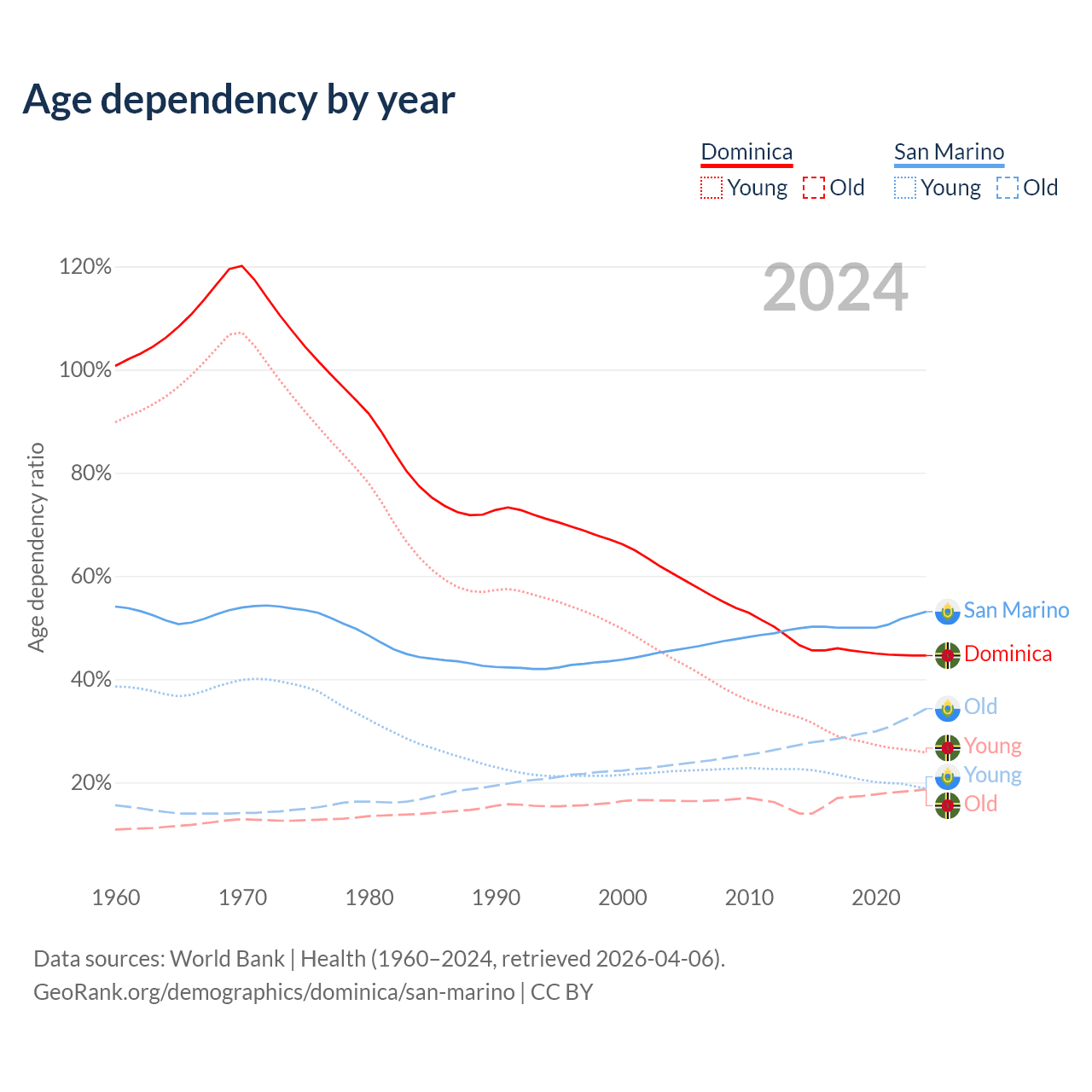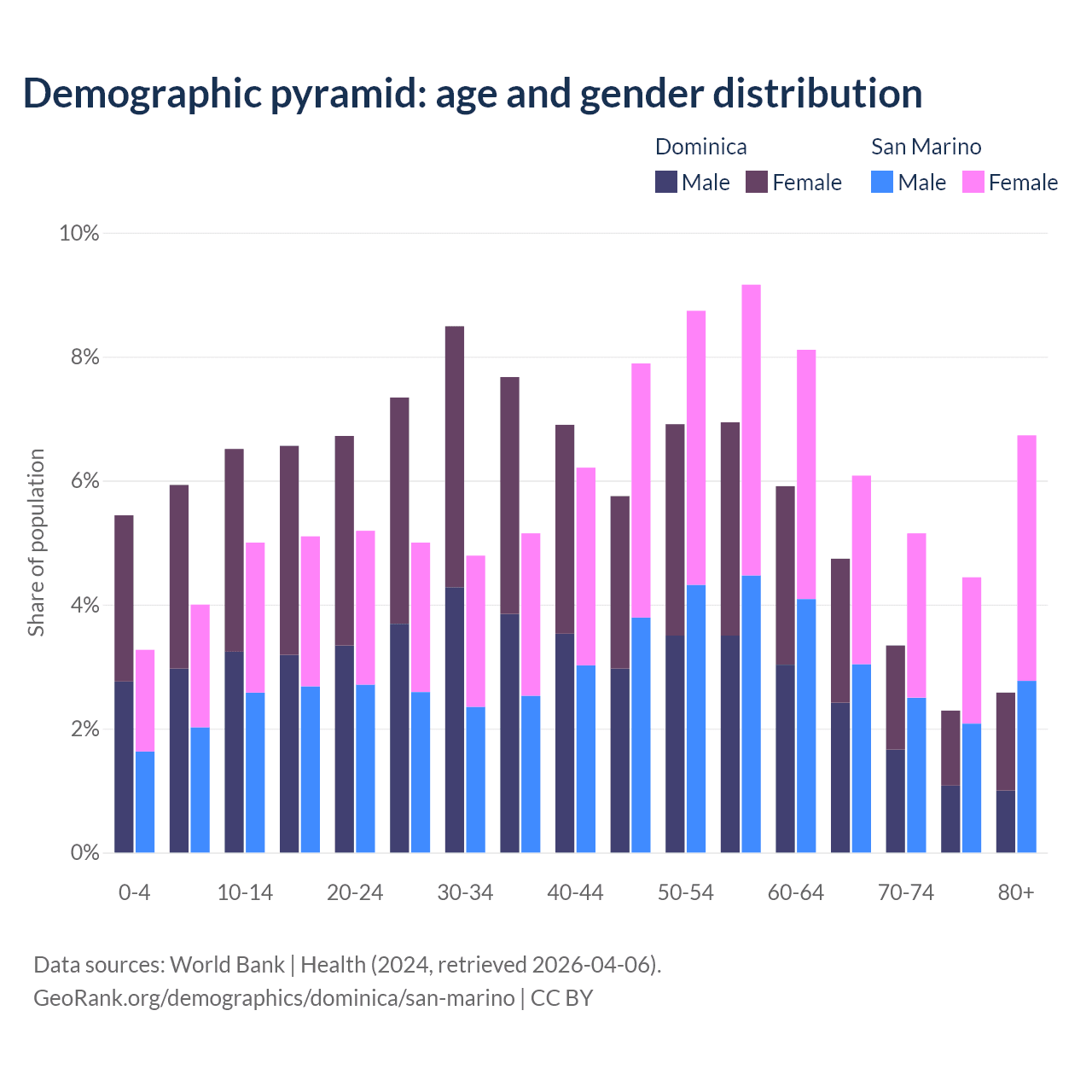 - Dominica is ranked 66/196 by median age (oldest to youngest) vs 3/196 for San Marino.