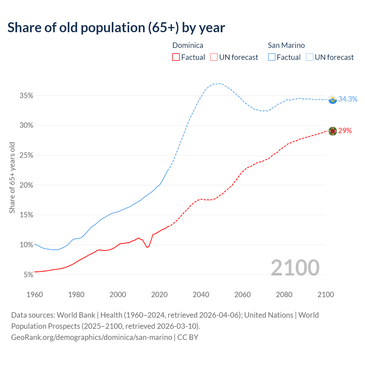 - The share of old-age demographic (65+) in Dominica is 13% vs 22.4% in San Marino.