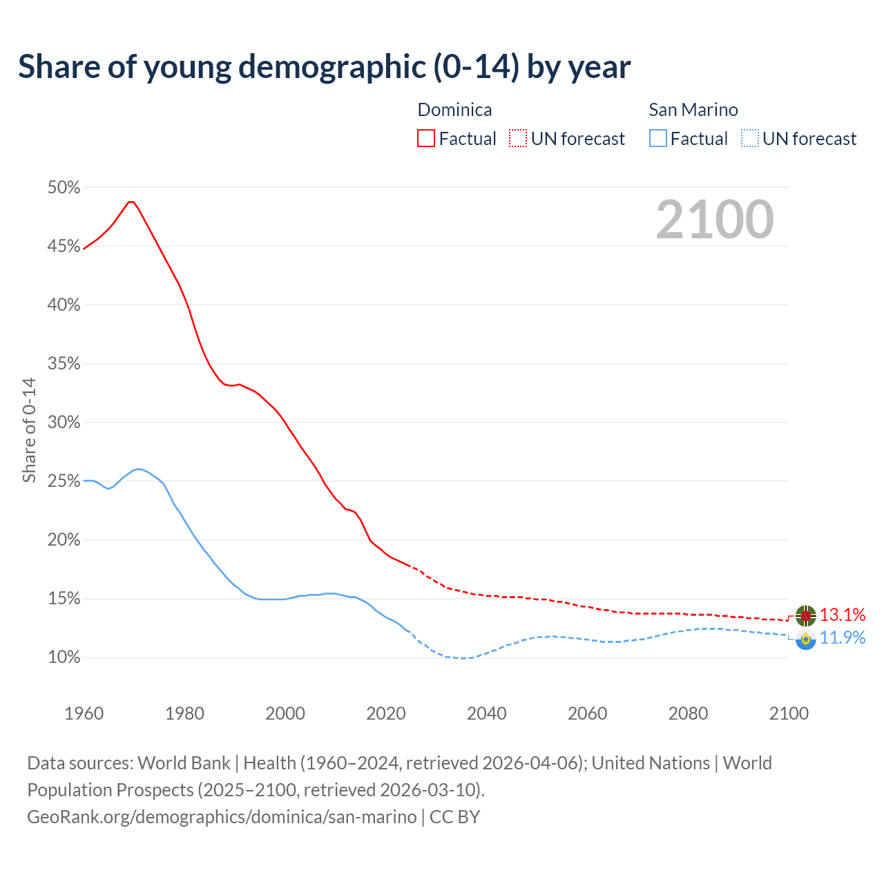 - The share of young demographic (0-15 years old) in Dominica is 17.9% vs 12.3% in San Marino.