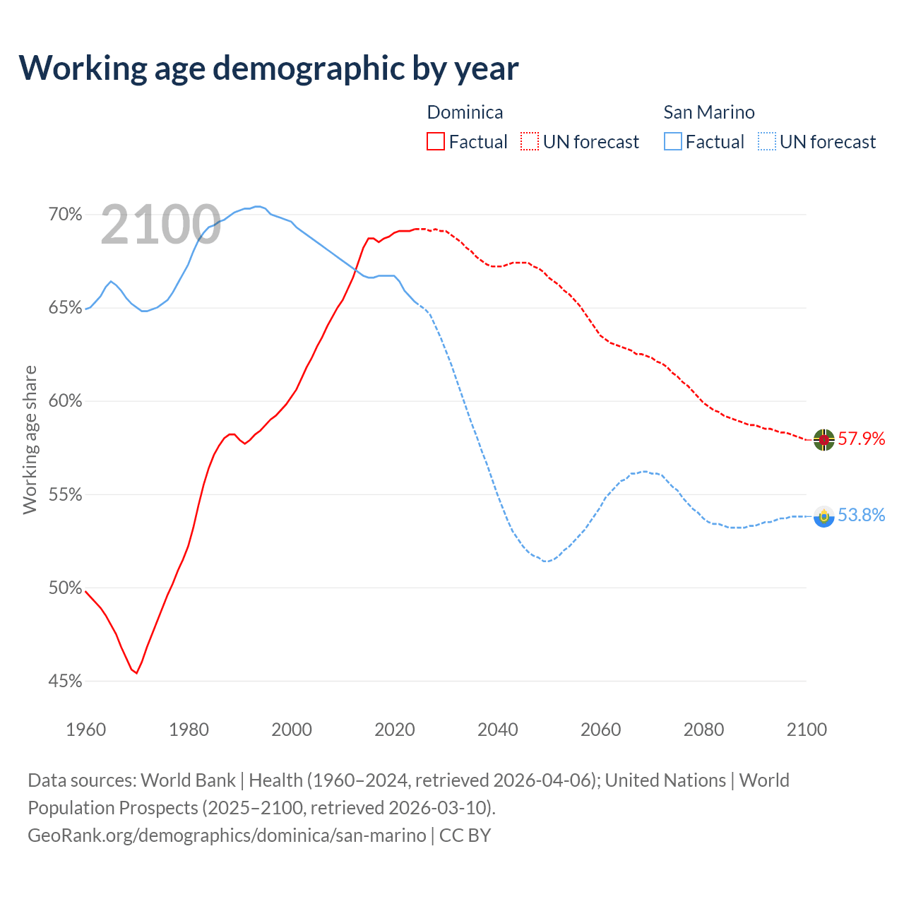 - Dominica has 45.3K working age adults (aged 15-64) vs 22.2K in San Marino.