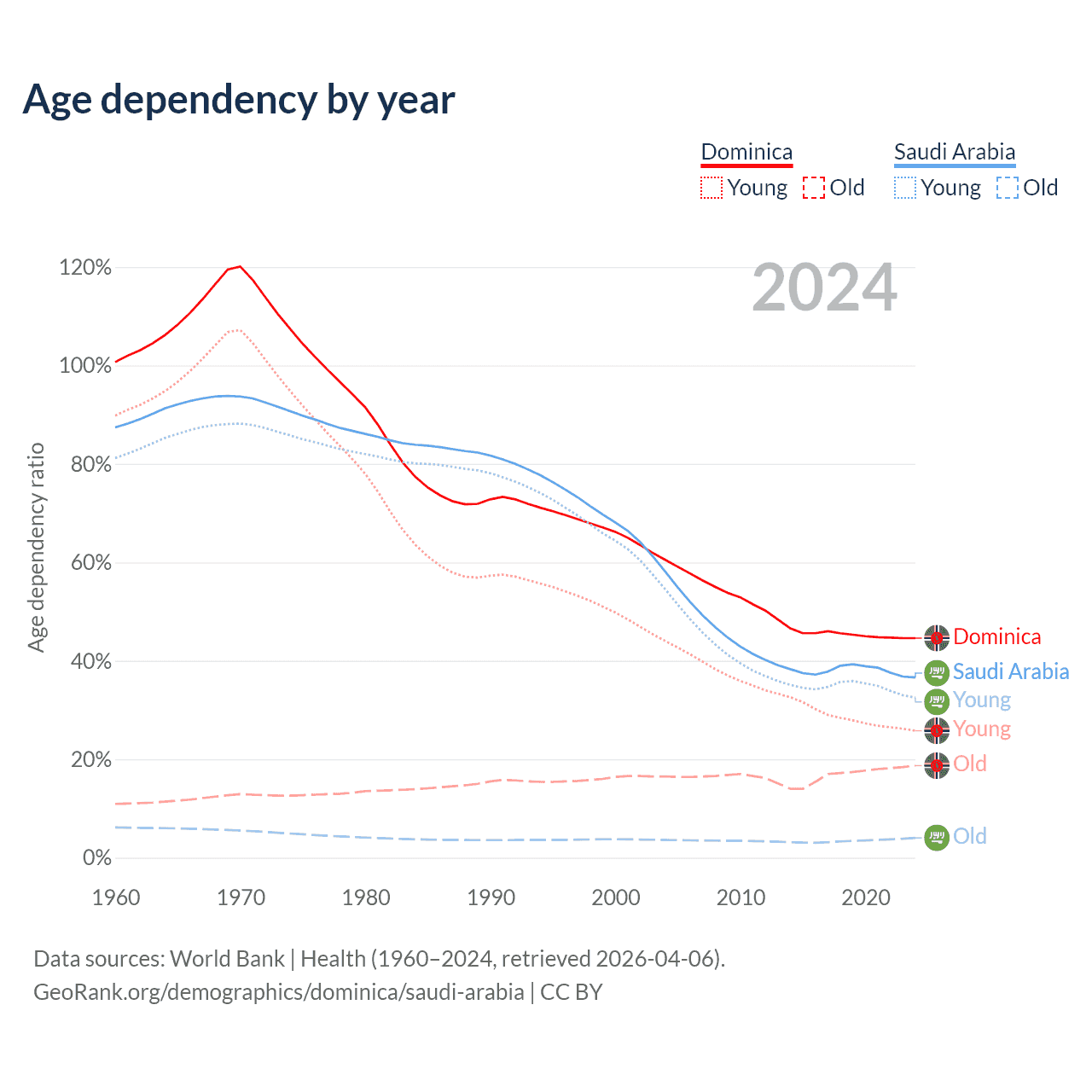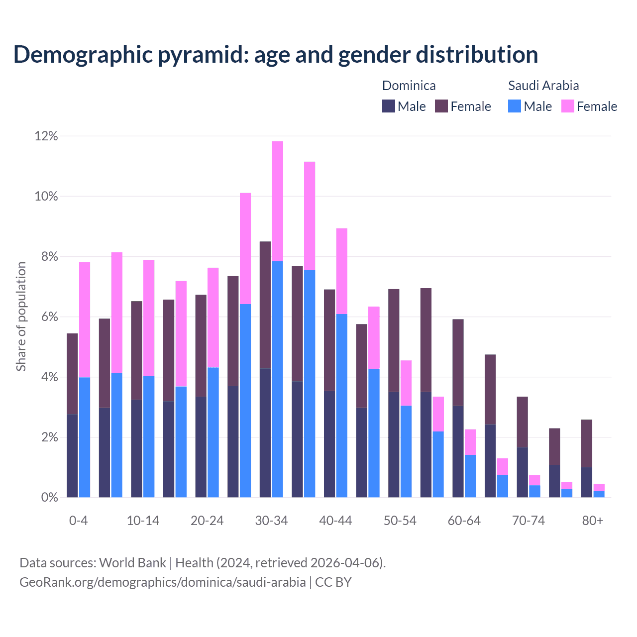 - Dominica is ranked 66/196 by median age (oldest to youngest) vs 98/196 for Saudi Arabia.