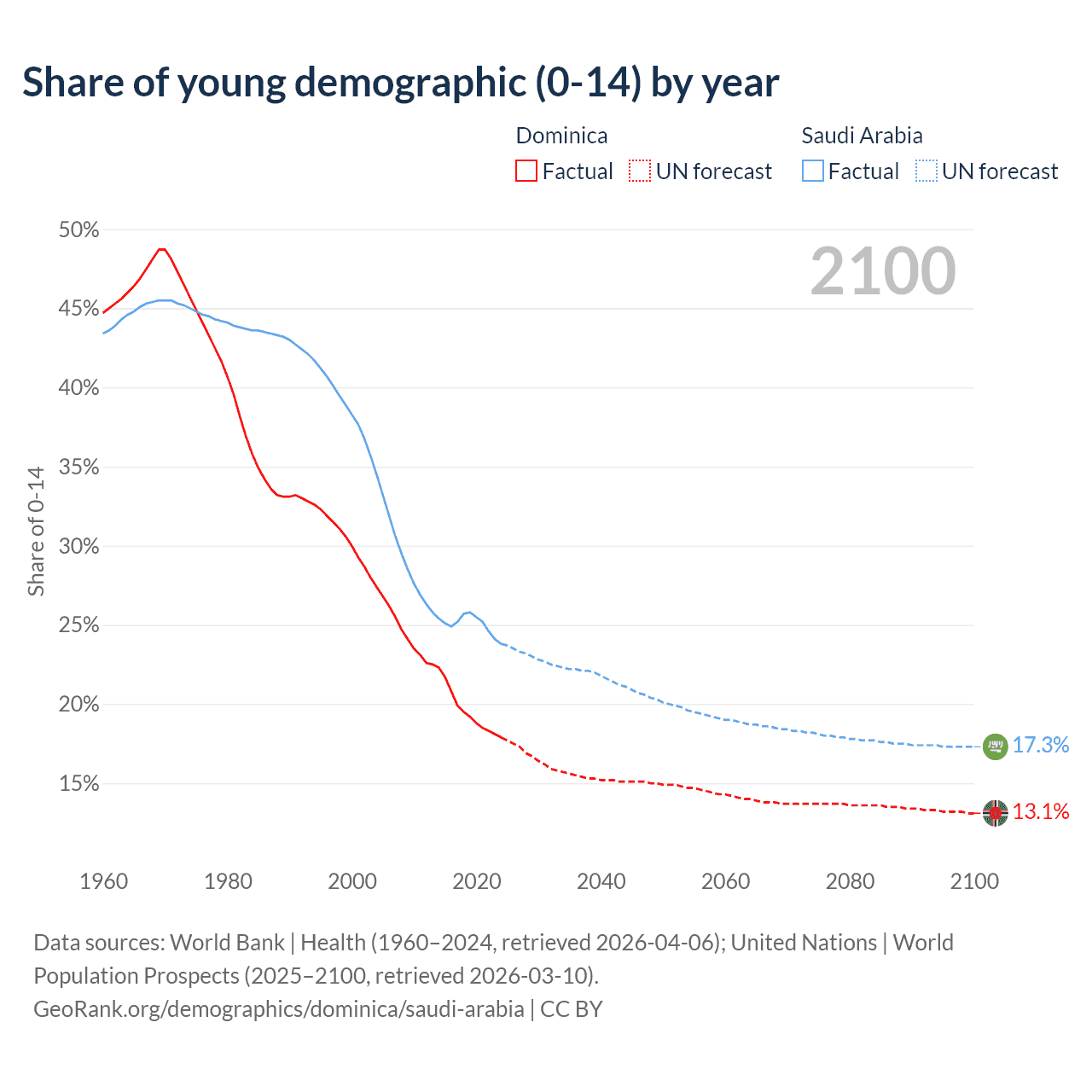- The share of young demographic (0-15 years old) in Dominica is 17.9% vs 23.8% in Saudi Arabia.