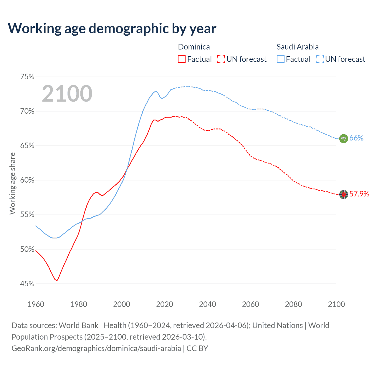 - Dominica has 45.3K working age adults (aged 15-64) vs 26.9M in Saudi Arabia.