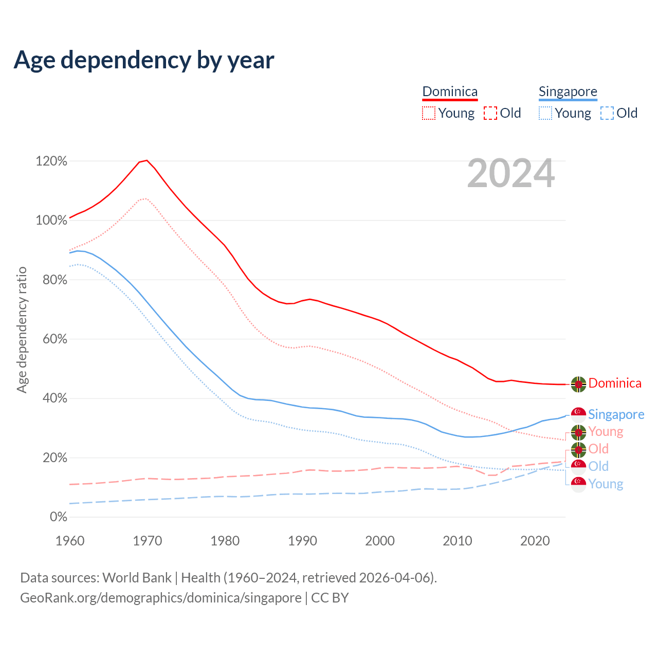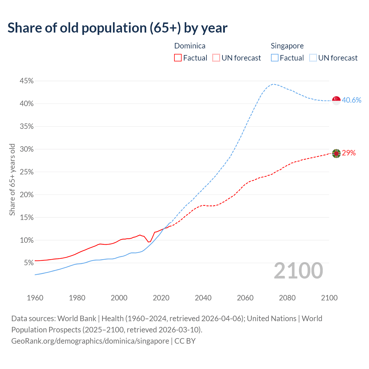 The share of older people aged 65 and over is 13% in Dominica and 13.7% in Singapore. Life expectancy in Dominica compared to Singapore .