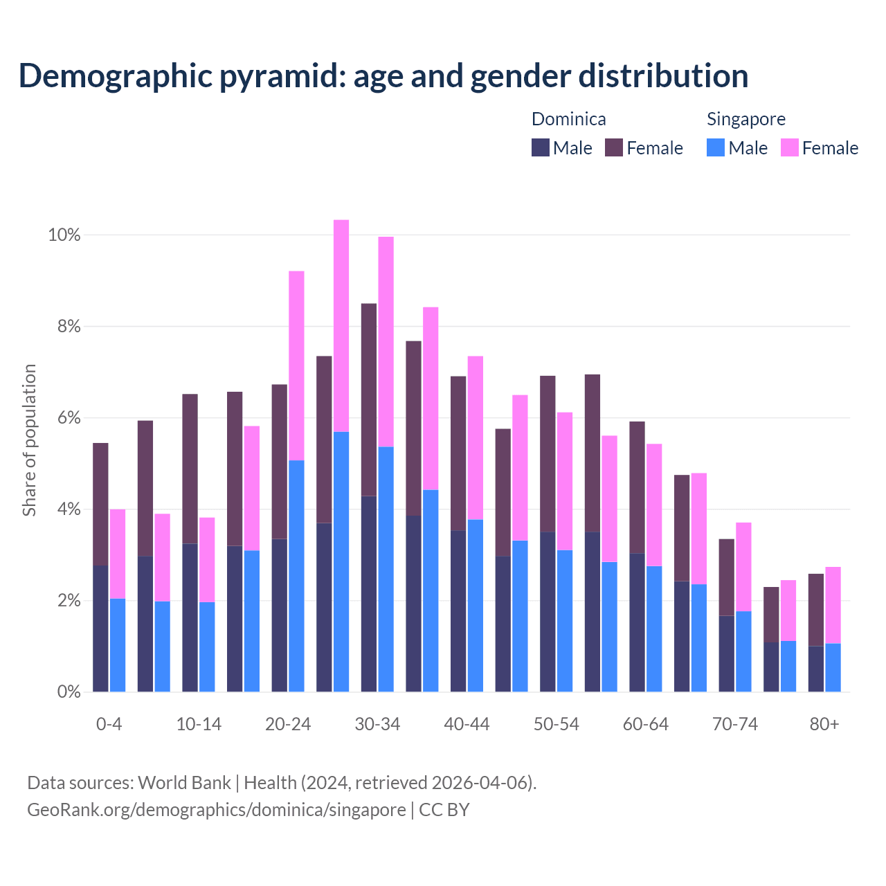 - Dominica is ranked 66/196 by median age (oldest to youngest) vs 68/196 for Singapore.
