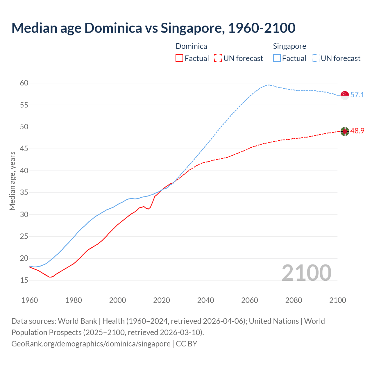 Median age Dominica vs Singapore, 1960-2100