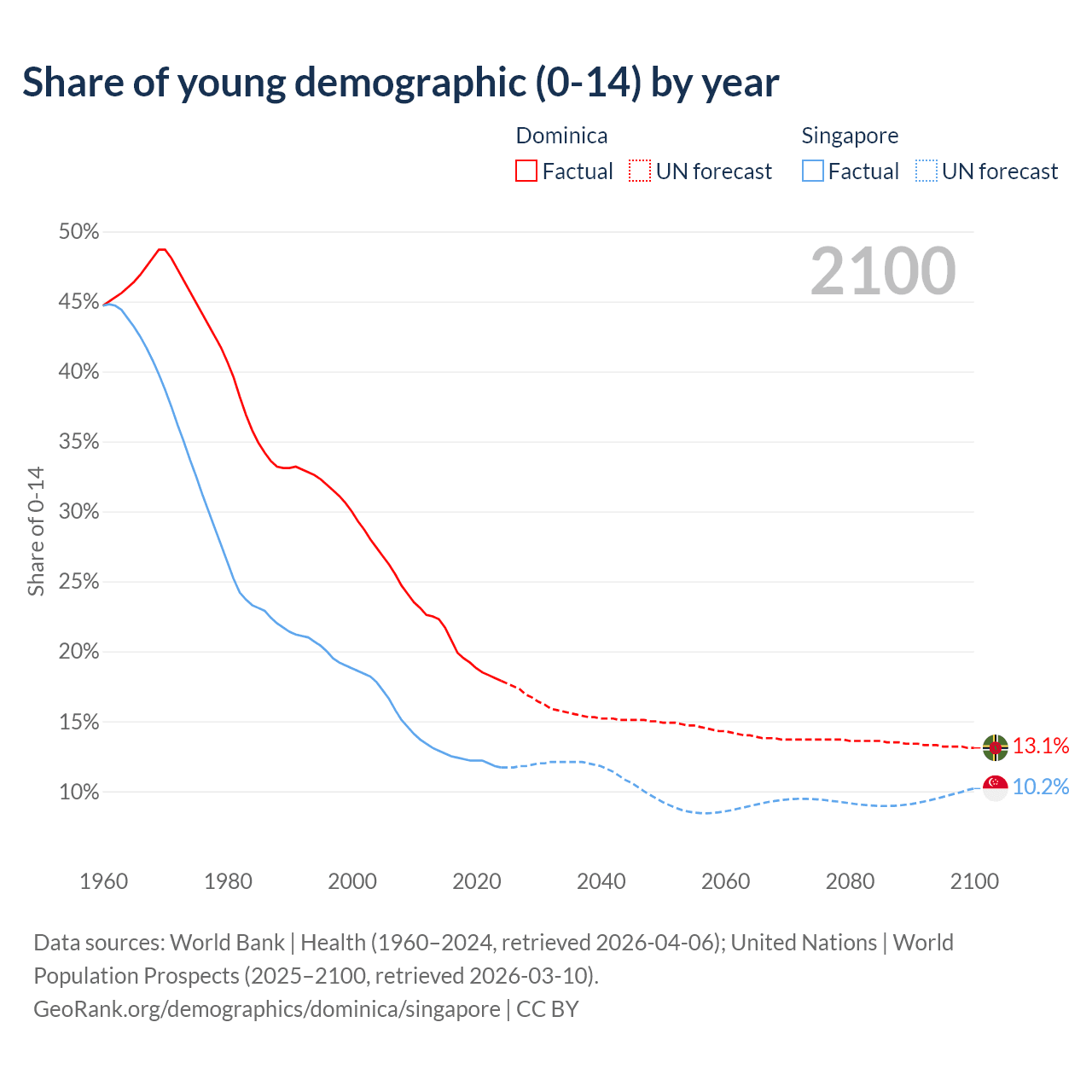 - The share of young demographic (0-15 years old) in Dominica is 17.9% vs 11.7% in Singapore.