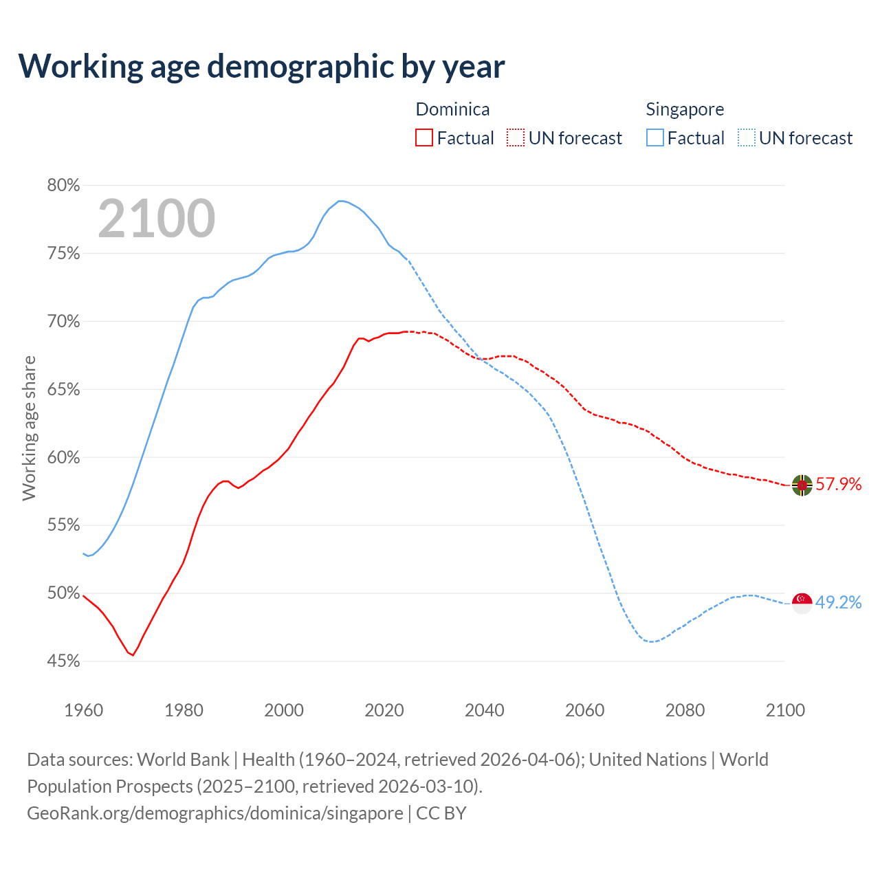 - Dominica has 45.3K working age adults (aged 15-64) vs 4.57M in Singapore.