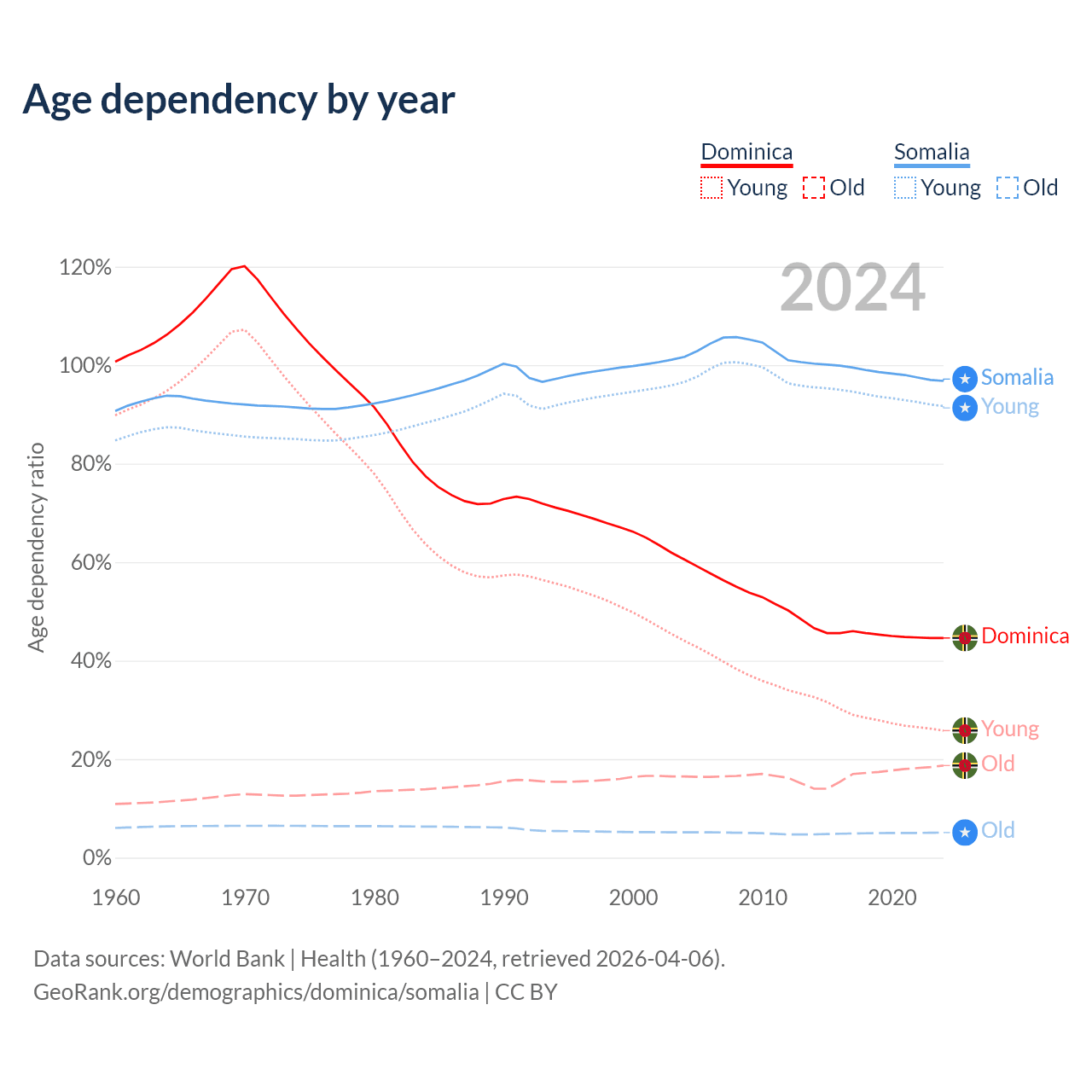 - Dominica is ranked 66/196 by median age (oldest to youngest) vs 194/196 for Somalia.