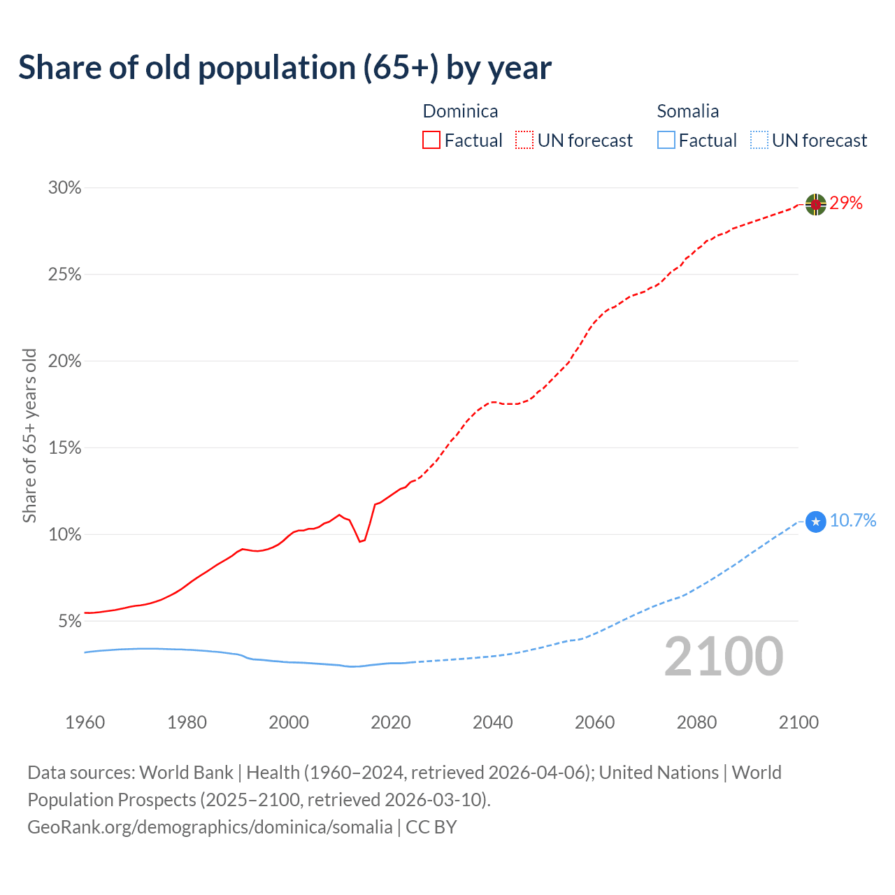 - The share of old-age demographic (65+) in Dominica is 13% vs 2.59% in Somalia.