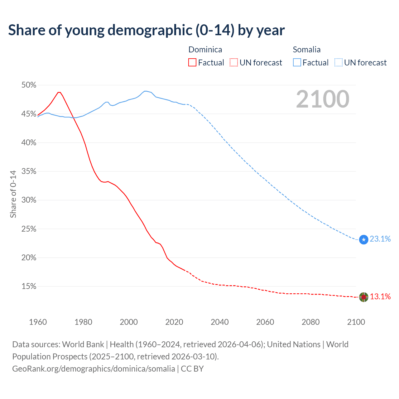 - The share of young demographic (0-15 years old) in Dominica is 17.9% vs 46.6% in Somalia.