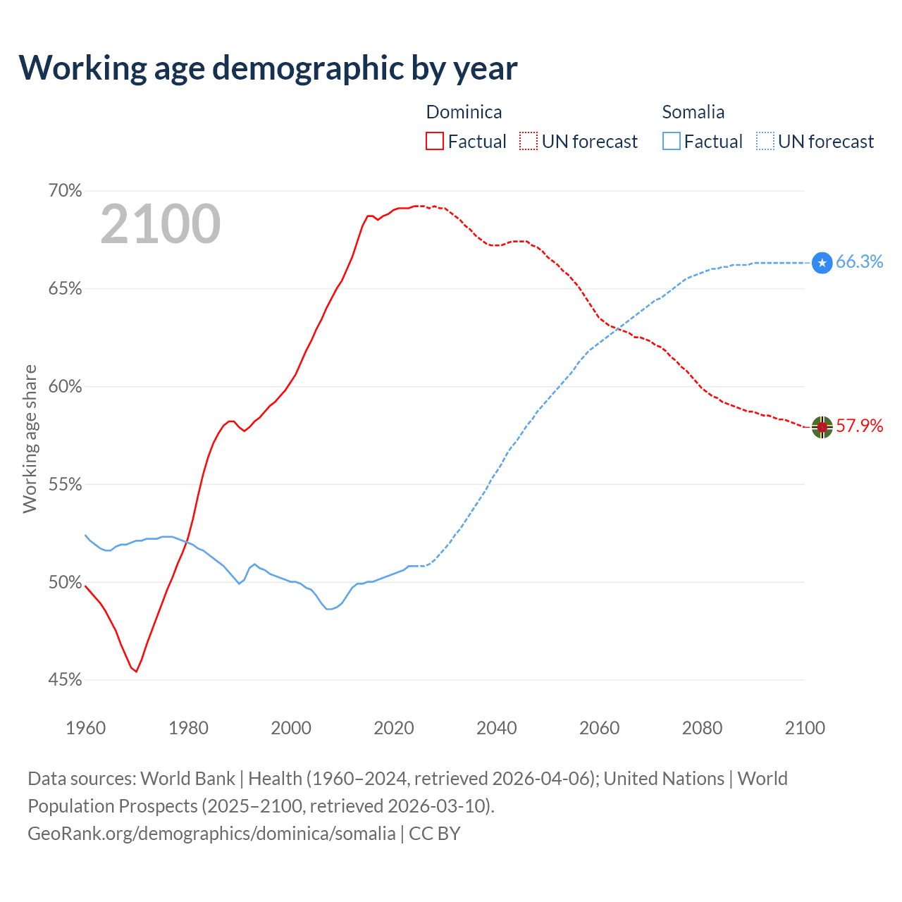 - Dominica has 45.3K working age adults (aged 15-64) vs 10.4M in Somalia.