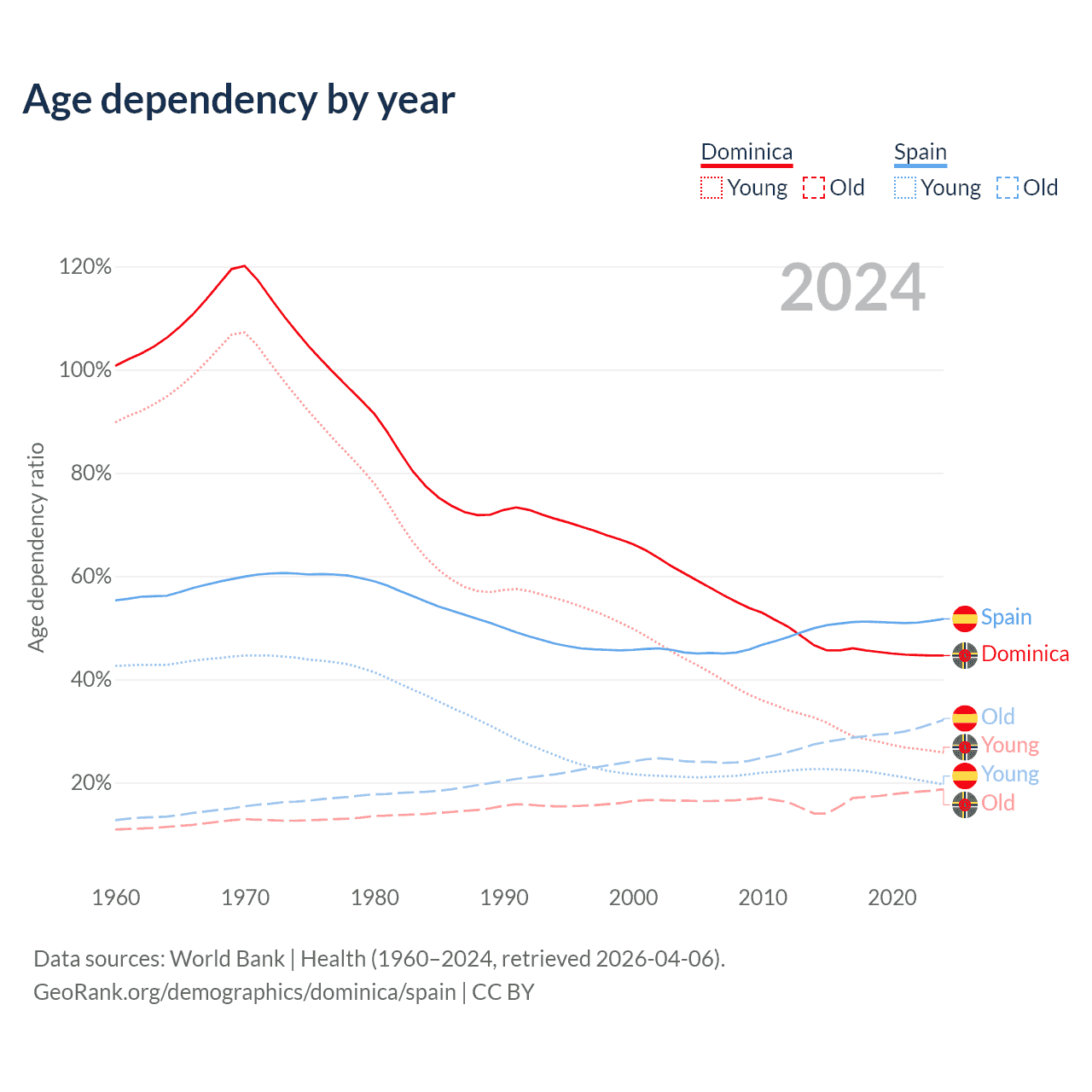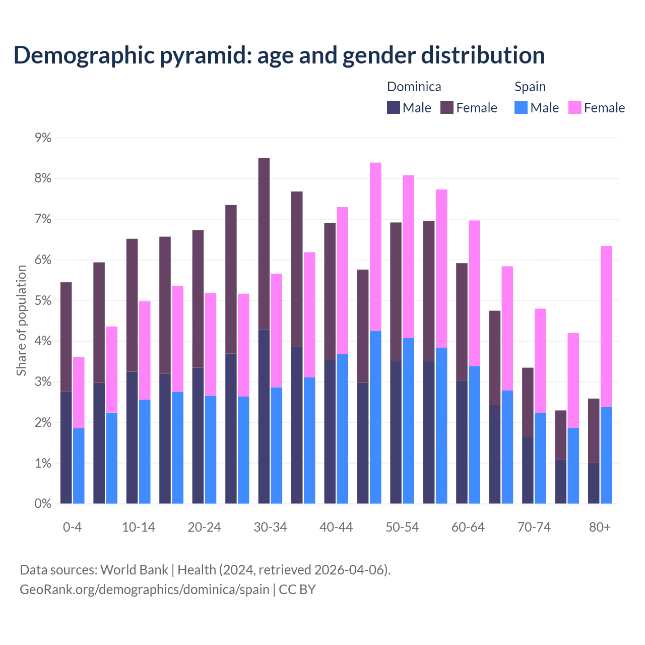- Dominica is ranked 66/196 by median age (oldest to youngest) vs 7/196 for Spain.