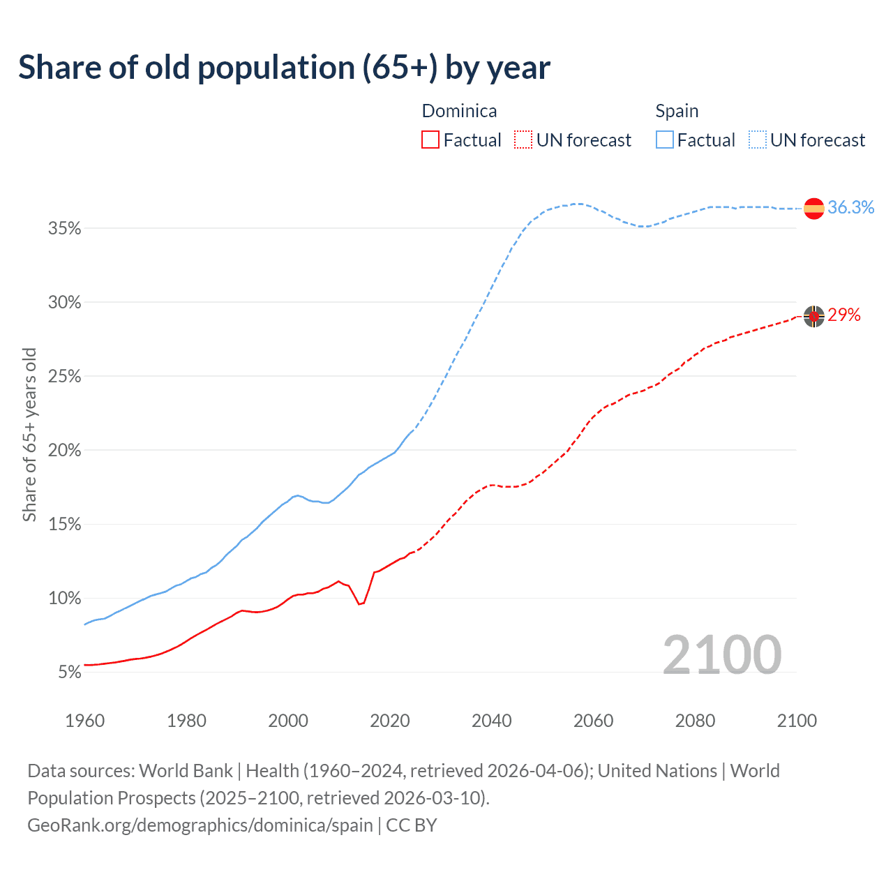 The share of older people aged 65 and over is 13% in Dominica and 21.1% in Spain. Life expectancy in Dominica compared to Spain .